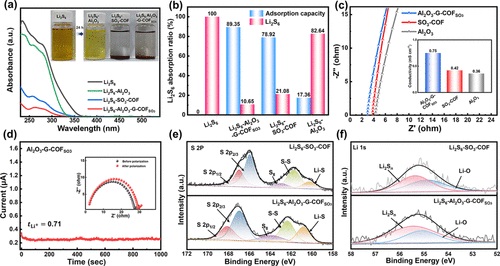 5) 紫外-可见光谱(UV–vis):用于分析多硫化物与聚合物Al2O3, SO3–COF, 和Al2O3-G-COFSO3之间的相互作用,结果表明Al2O3-G-COFSO3对Li2S6的吸附容量最高。