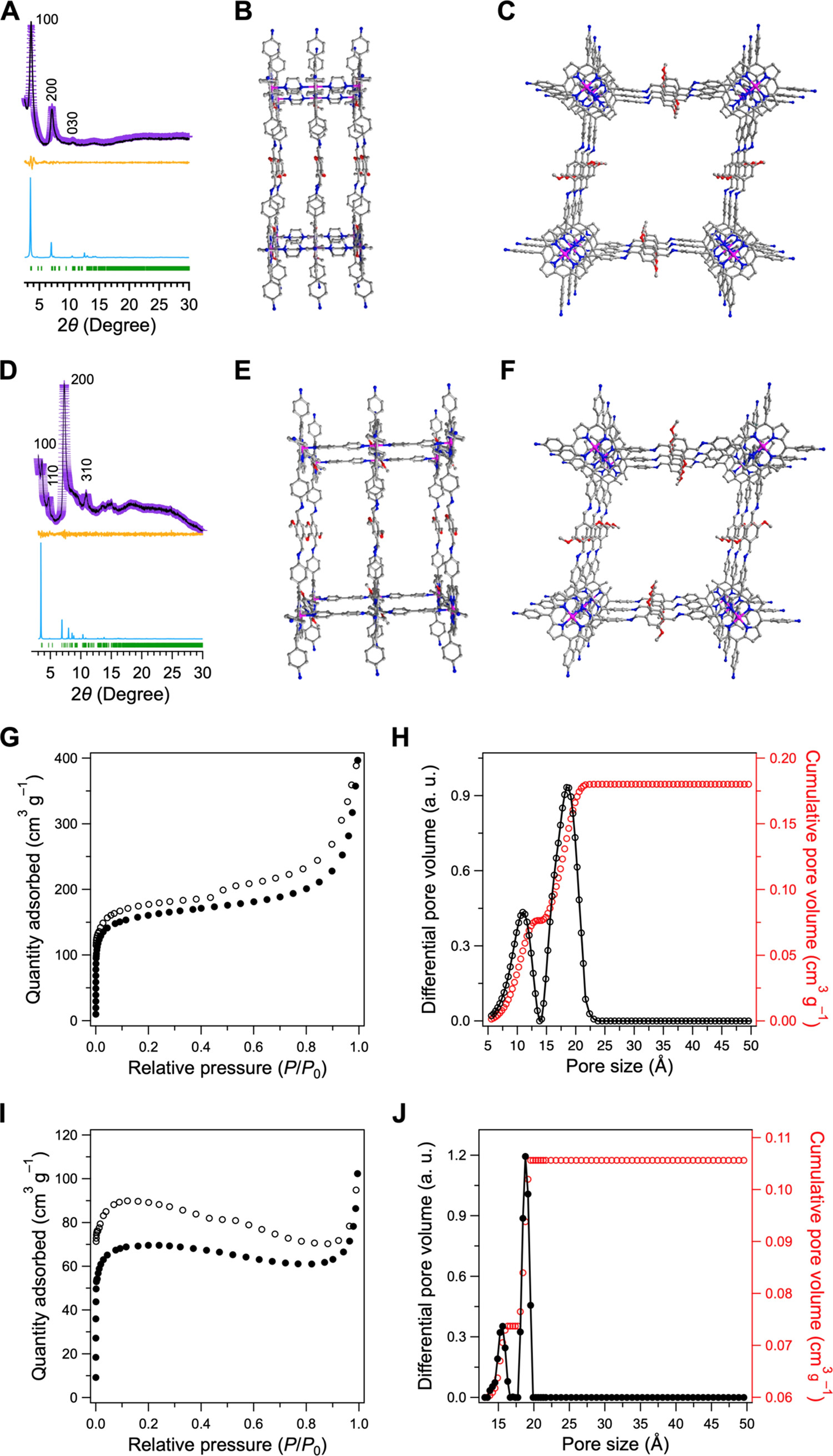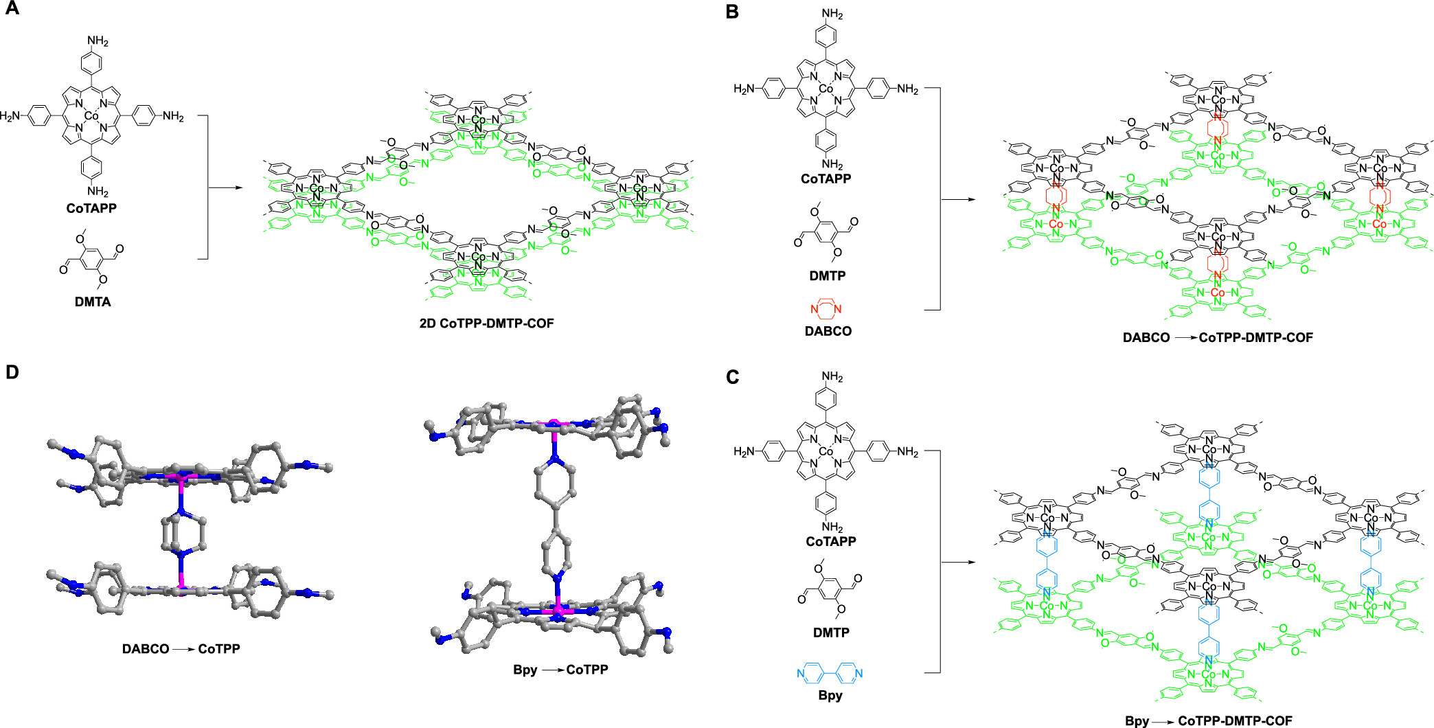 1) 在10 mL的Pyrex管中混合CoTAPP (18.3 mg, 0.025 mmol)和4,4-二吡啶(Bpy, 390.5 mg, 2.5 mmol)在0.2 mL的正丁醇中,超声处理3分钟后,在60°C下加热36小时。冷却至室温后,加入DMTA (9.7 mg, 0.05 mmol)、o-DCB (0.5 mL)、正丁醇 (0.5 mL)和冰醋酸(34 µL)。经过三次冻融泵抽循环后,火焰封闭管口并在120°C下保持3天。沉淀物用丙酮和THF洗涤,Soxhlet提取器中用THF浸泡24小时,然后用超临界CO2激活。在100°C下抽真空6小时得到Bpy®CoTPP-DMTP-COF,产率为79%。