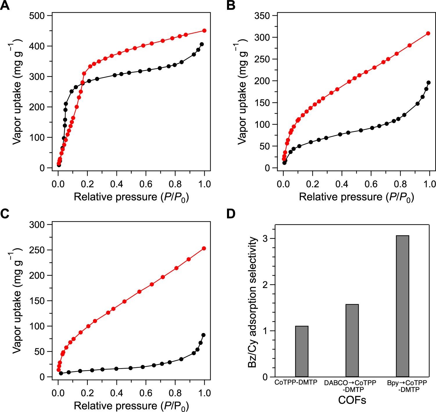 1) CoTPP-DMTP-COF在50/50体积比的苯/环己烷混合物中的突破点为1183.9 s g−1(环己烷)和1316.3 s g−1(苯)。