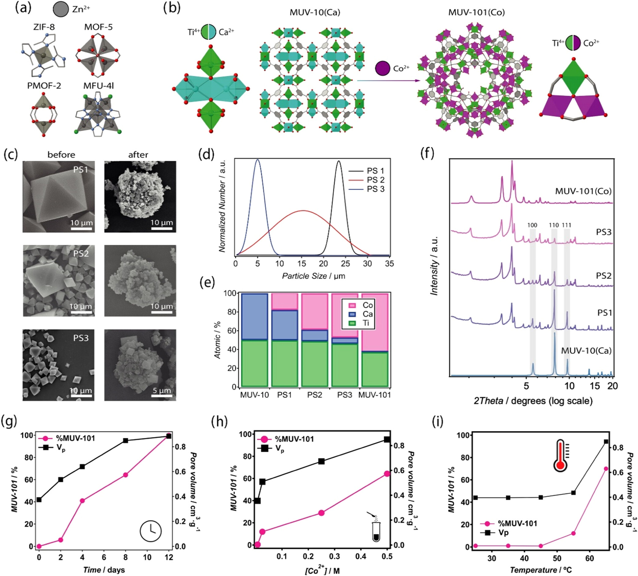 1) 将MUV-10(Ca)在不同条件下与Co(NO3)2的甲醇溶液反应,通过ICP-MS和PXRD分析钙离子的替换情况。