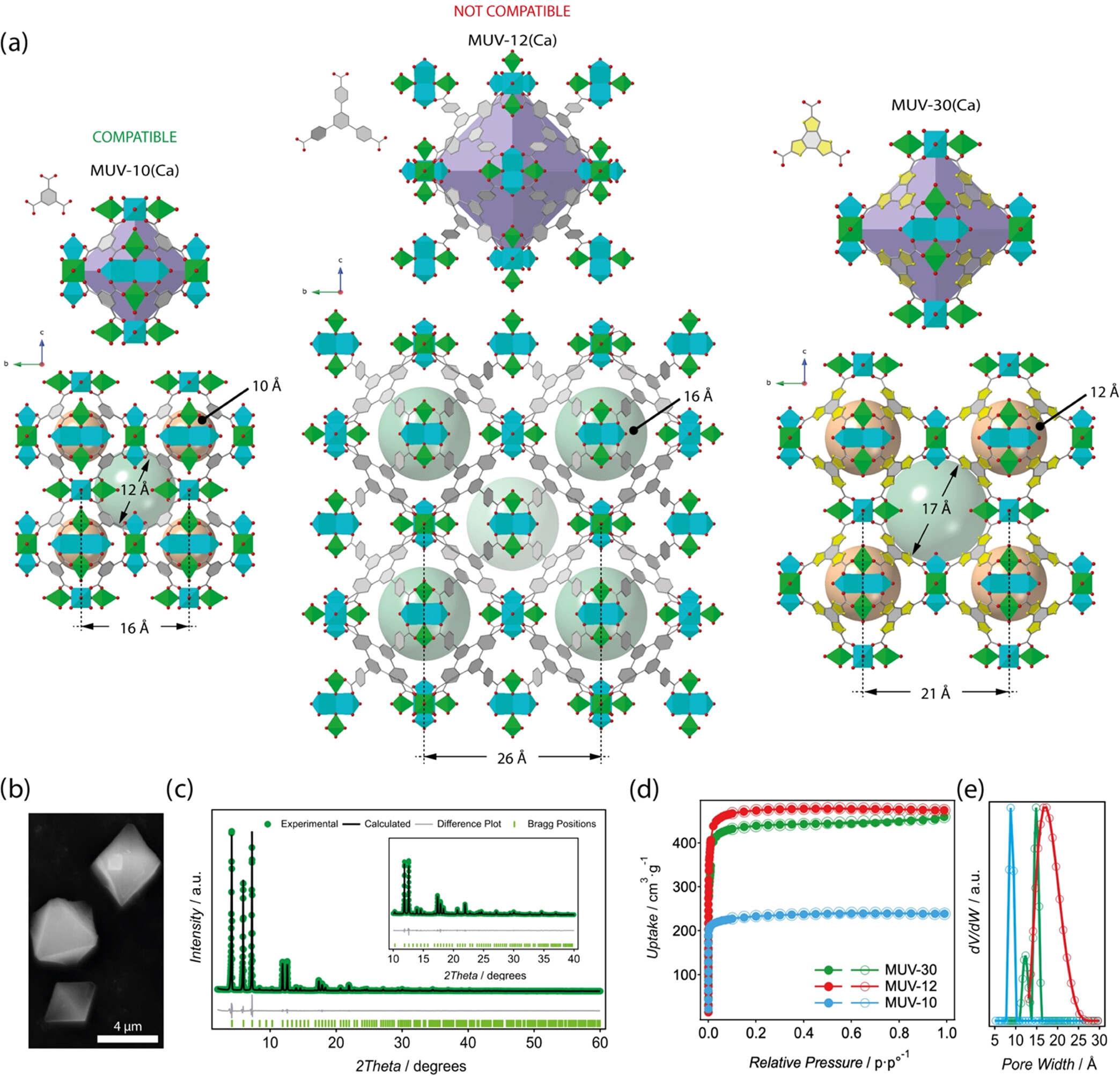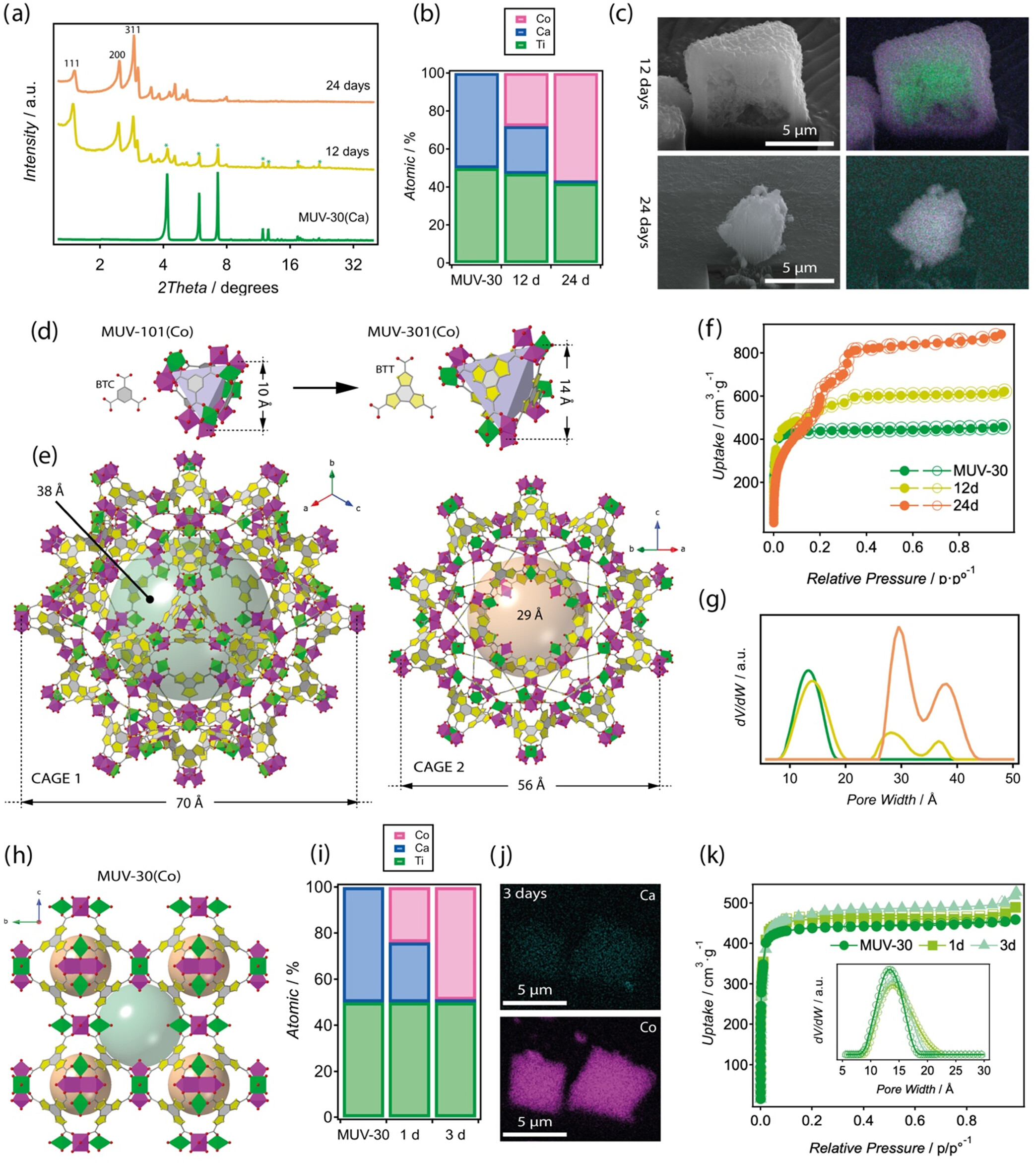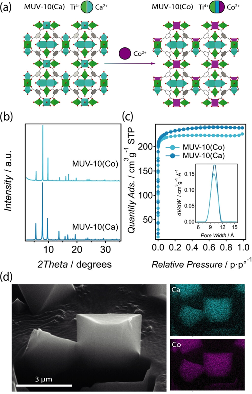 5. 比表面积和孔隙结构分析:MUV-30(Ca)和MUV-301(Co)的比表面积分别为1750 cm³/g和2577.4 cm³/g,孔径分布中心在~2 nm。