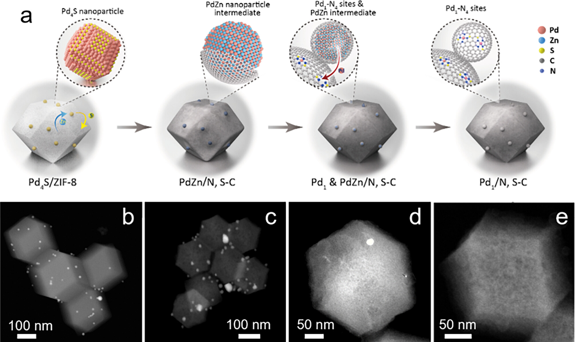 1) 将50 mg制备的Pd-S/C与200 mg ZIF-8在15 mL乙醇中混合,在开放烧瓶中75°C搅拌至干燥(Pd-S/C/ZIF-8)。