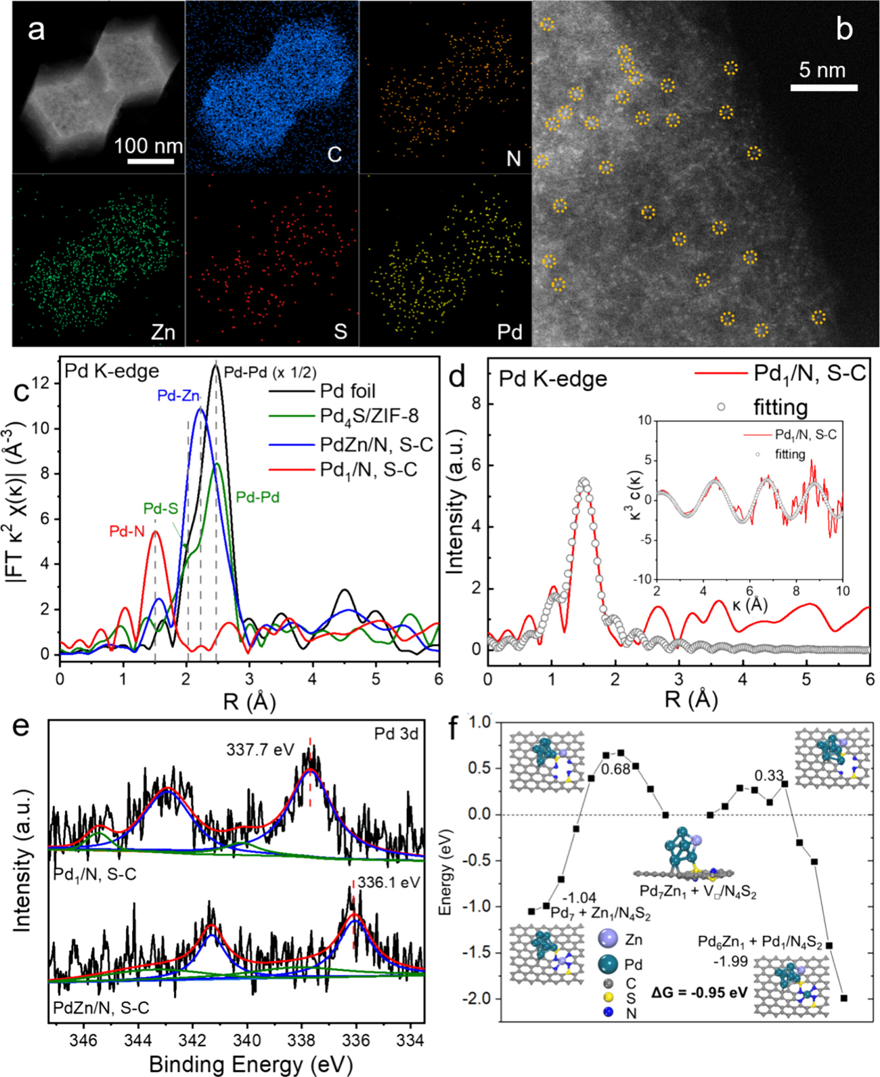 4. X射线光电子能谱(XPS)表征:在国家同步辐射实验室(NSRL)的催化与表面科学末端站进行,样品涂覆在双面碳带上进行表征。XPS结果显示Pd1/N, S−C的Pd 3d峰位于337.7 eV,而PdZn/N, S−C的Pd 3d峰位于336.1 eV,表明Pd1/N, S−C中Pd的氧化态更高。