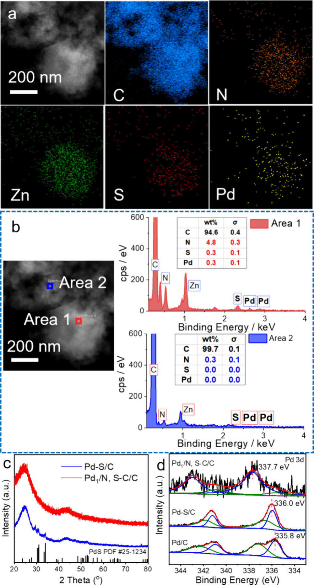 3. 高分辨率透射电子显微镜(HRTEM)、高角环形暗场扫描透射电子显微镜(HAADF-STEM)和元素映射表征:在JEOL-2100F FETEM上进行,电子加速能量为200 kV。HRTEM和HAADF-STEM图像显示Pd、C、N和S元素在整个纳米结构中均匀分布,且Pd以单原子形式存在,未观察到Pd团簇或小颗粒。