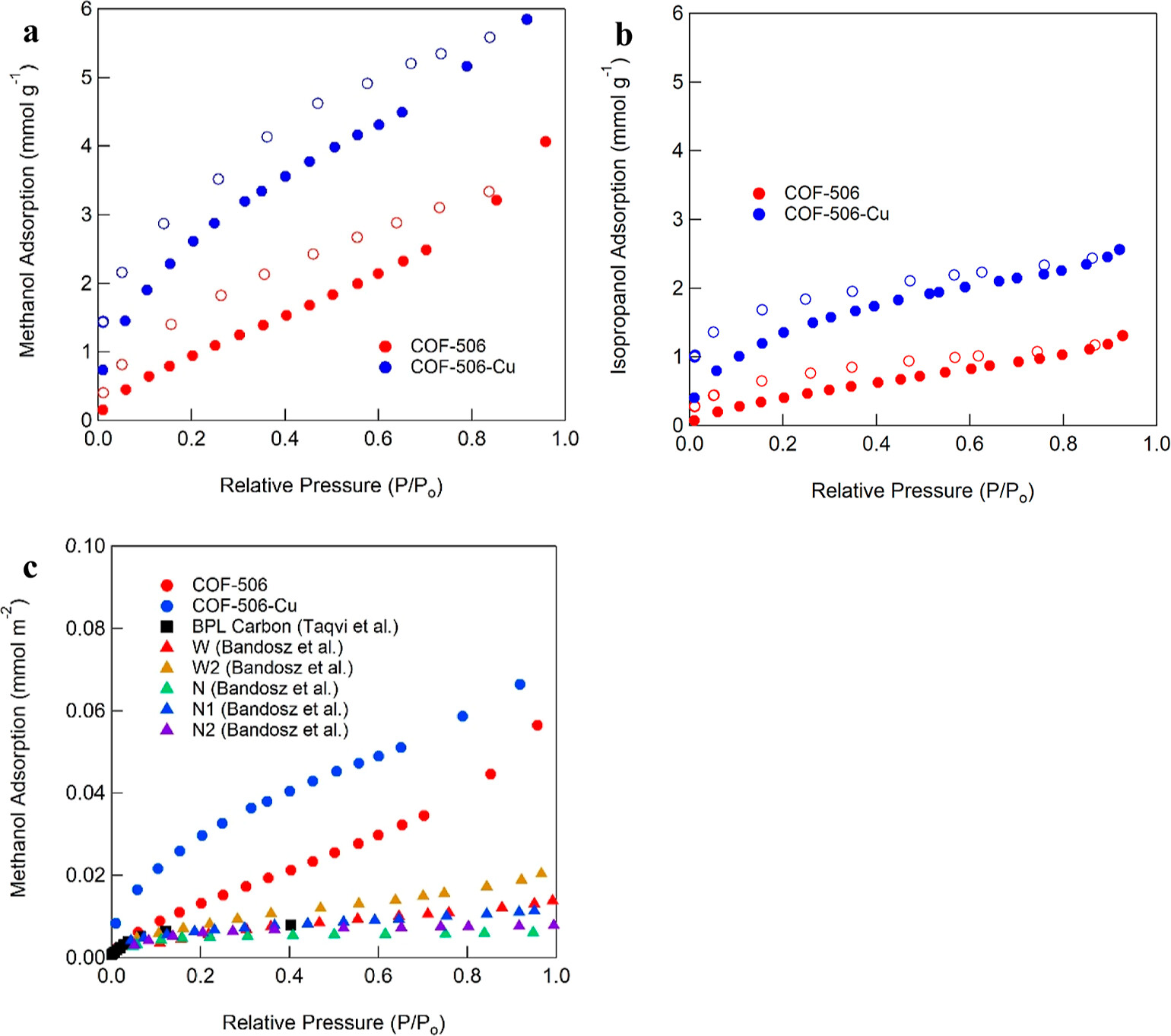 1) 使用Micromeritics 3Flex仪器在25°C下对COF-506和COF-506-Cu进行乙烷、乙烯、CO2、n-戊烷、n-己烷、环戊烷、环己烷、甲醇和异丙醇的吸附等温线测定。