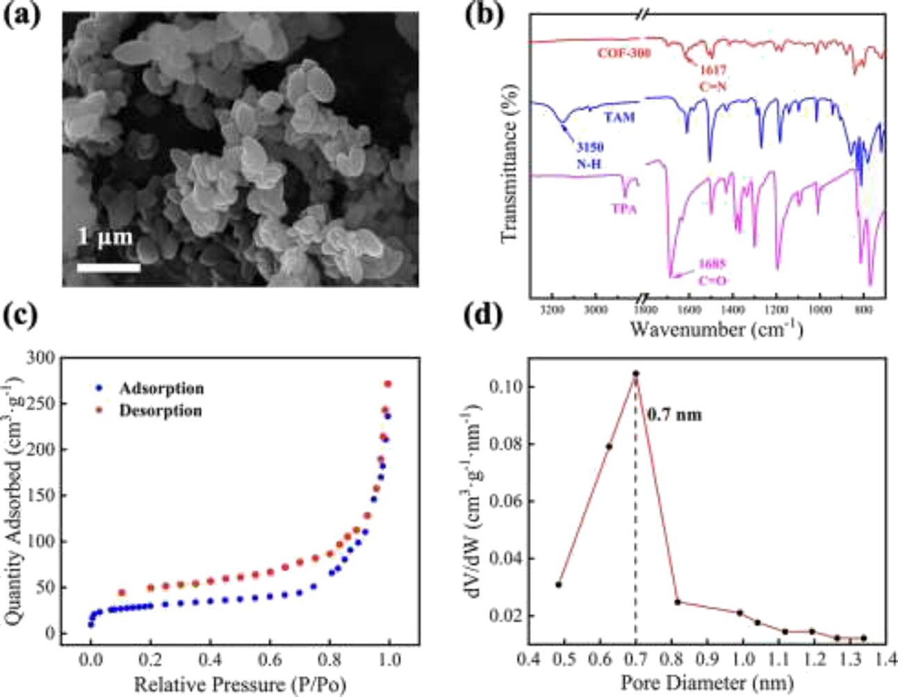 1. BET比表面积和孔径:COF-300的孔径为0.7 nm,接近理论大小(0.79 nm)。
