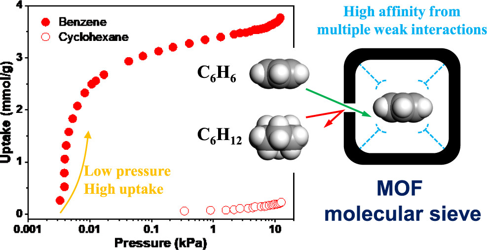 )中报道了一种金属-有机框架(MOF)吸附剂,它对苯(Bz)和环己烷(Cy)表现出分子筛效应,并在它们的液体混合物中实现了创纪录的Bz/Cy吸附选择性(分别为216、723和1027,v/v比为1:1、1:10和1:20)。该MOF能有效捕获低分压下气相中的Bz分子(例如,在8.2 Pa下为2.49 mmol/g)或低含量液体环己烷中的Bz(例如,在20 ppm下为128 mg/g)。通过这种吸附剂,可以在室温下通过简单的剥离步骤去除超过99%的环己烷中微量的Bz(1000 ppm),得到纯度超过99.999%的环己烷。通过单晶结构分析揭示了MOF对Bz和Cy具有不同吸附特性的原因。