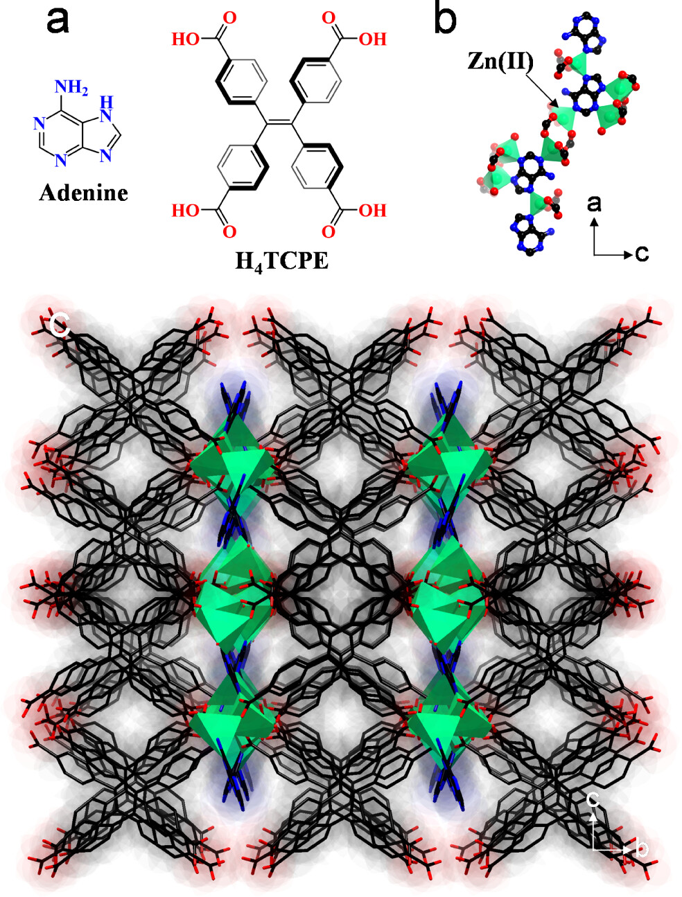 2) 将经过CH2Cl2交换的样品在100 °C下抽真空干燥10小时,得到β-Zn-Ade-TCPE。