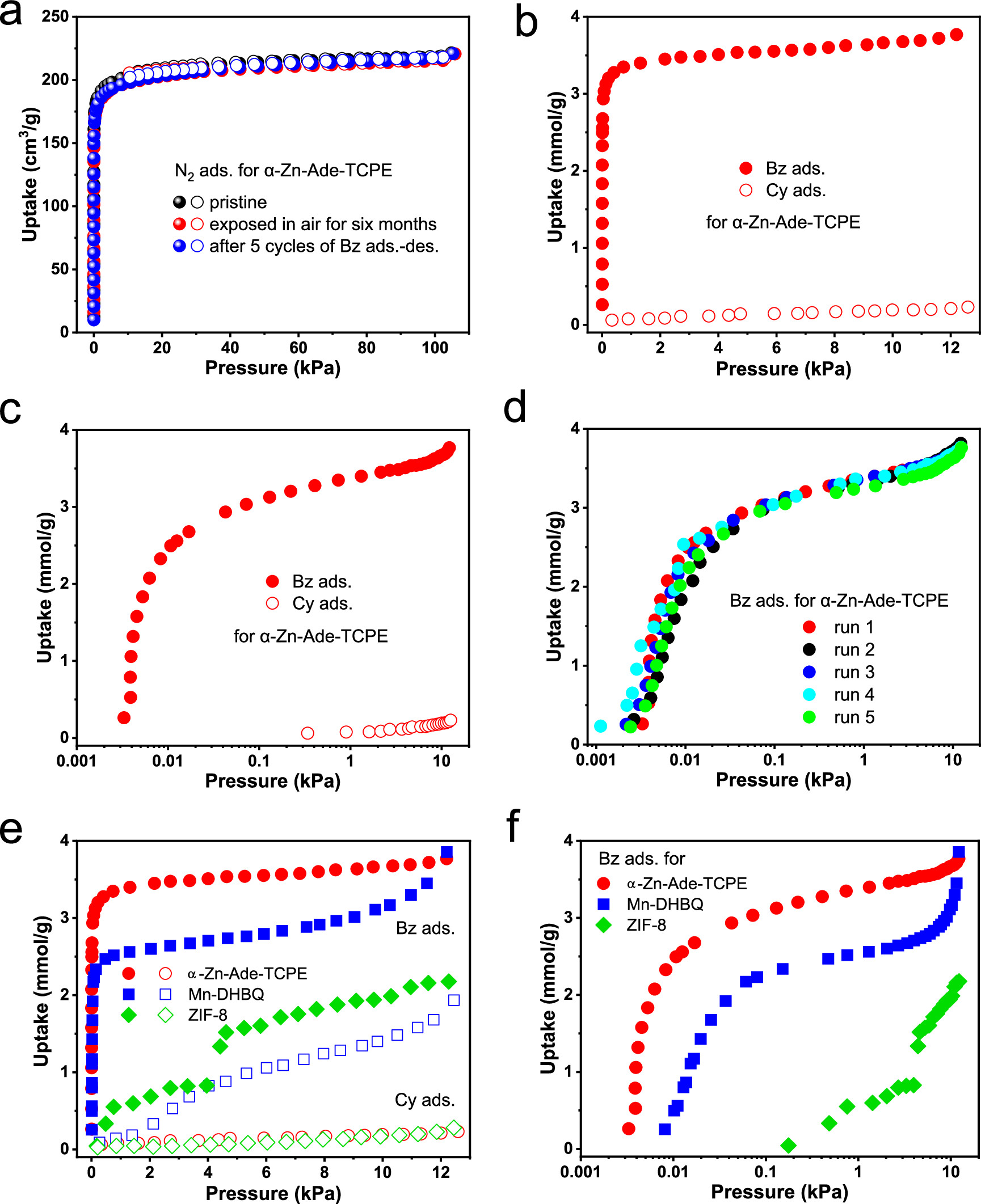 1) 将α-Zn-Ade-TCPE样品浸泡在不同比例的苯/环己烷液体混合物中,在密封条件下振荡6小时以实现吸附平衡。