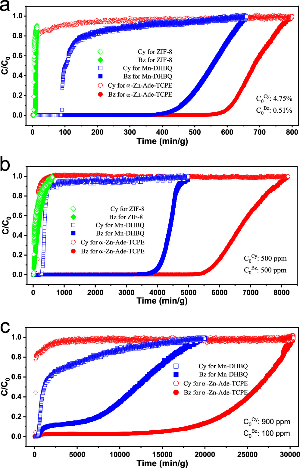 12. 动态穿透实验结果:α-Zn-Ade-TCPE在室温下能有效分离含约0.51%苯和约4.75%环己烷蒸汽的氮气流,苯的保留时间为约520 min/g。