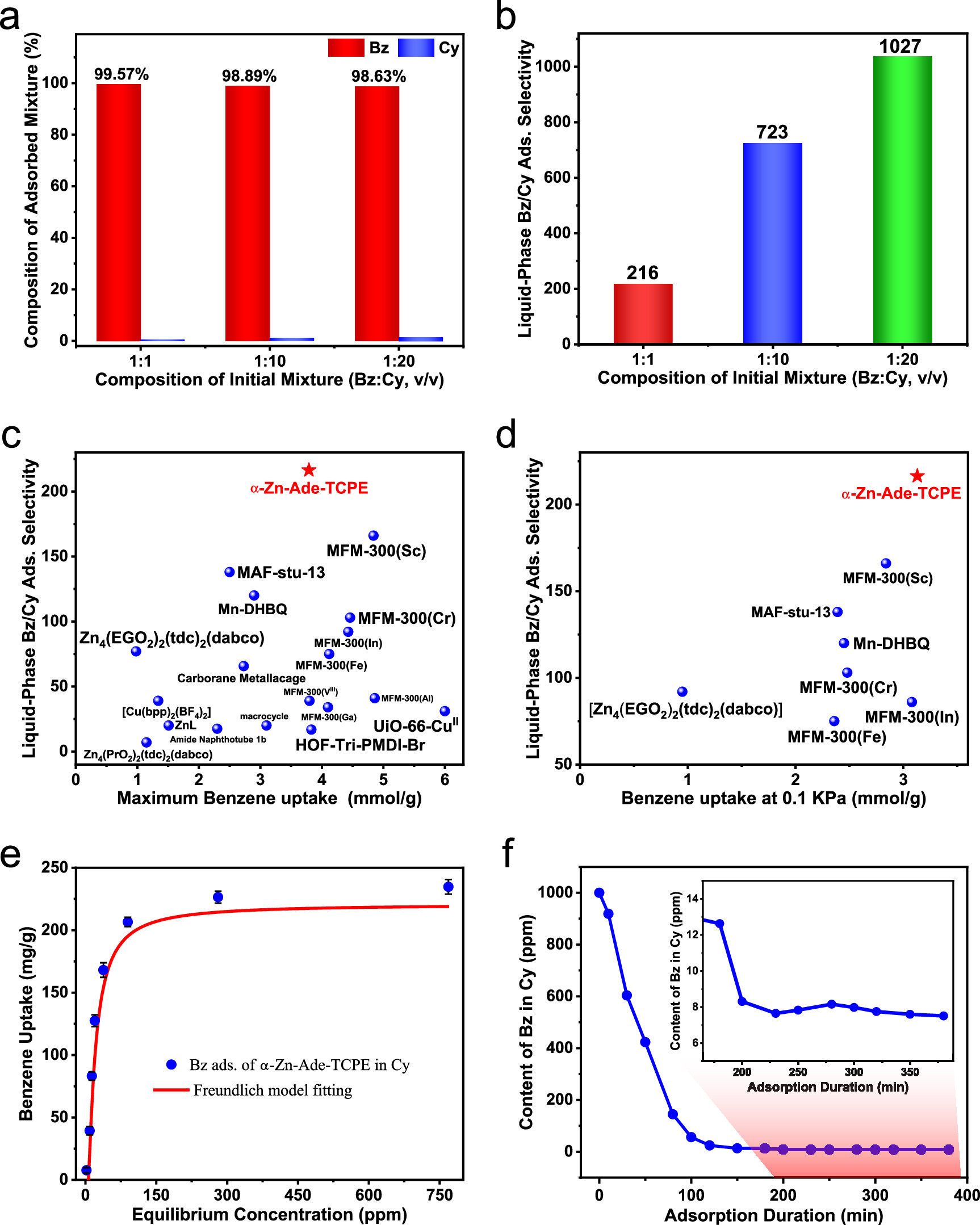 13. 液相吸附实验结果:α-Zn-Ade-TCPE在液相中对苯/环己烷混合物表现出极高的吸附选择性,最高可达1027。