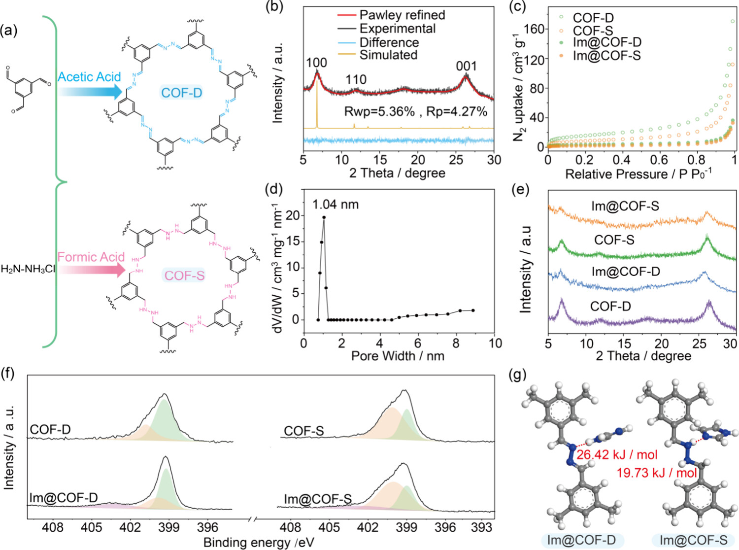 1) 将COF-D和COF-S置于玻璃瓶中,并将过量的咪唑置于玻璃瓶外但在同一高压釜内,然后将高压釜密封并在120 °C下加热7天,得到Im@COF-D和Im@COF-S。