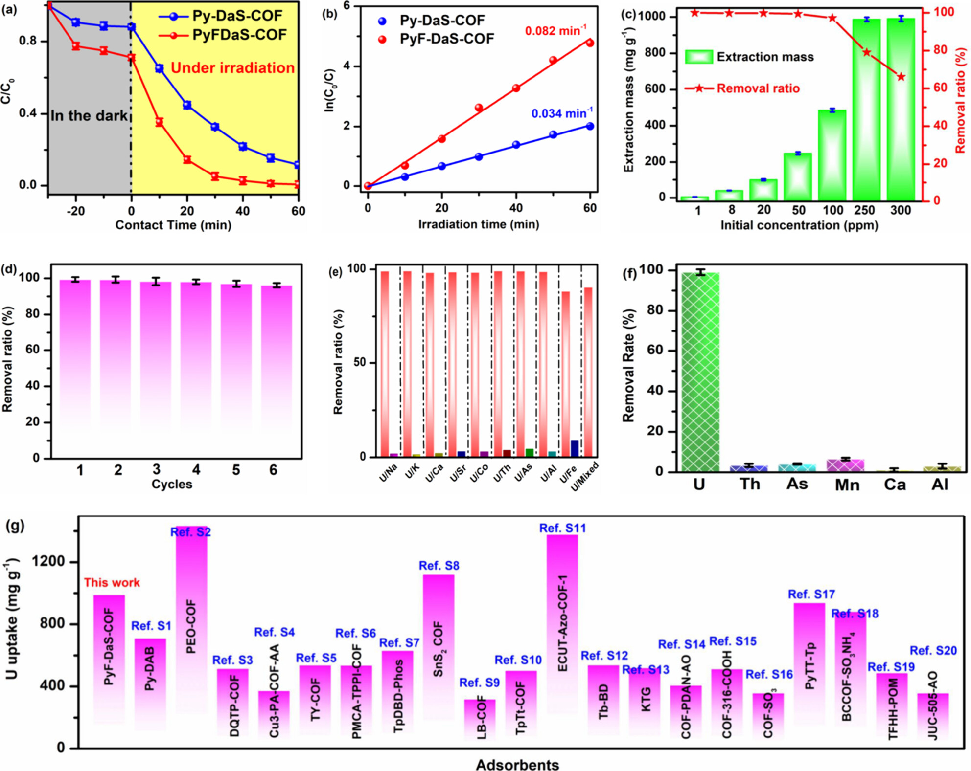 11. 光催化铀提取性能评估: PyF-DaS-COF在模拟光照射下,铀(VI)去除率在60分钟内达到99.4%,显著高于Py-DaS-COF的88.2%,其光反应速率常数k值为0.082 min−1,约为Py-DaS-COF的2.4倍,最大提取容量达到991.5 mg g−1。