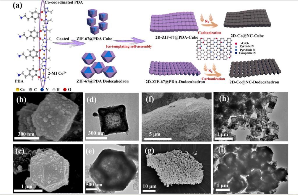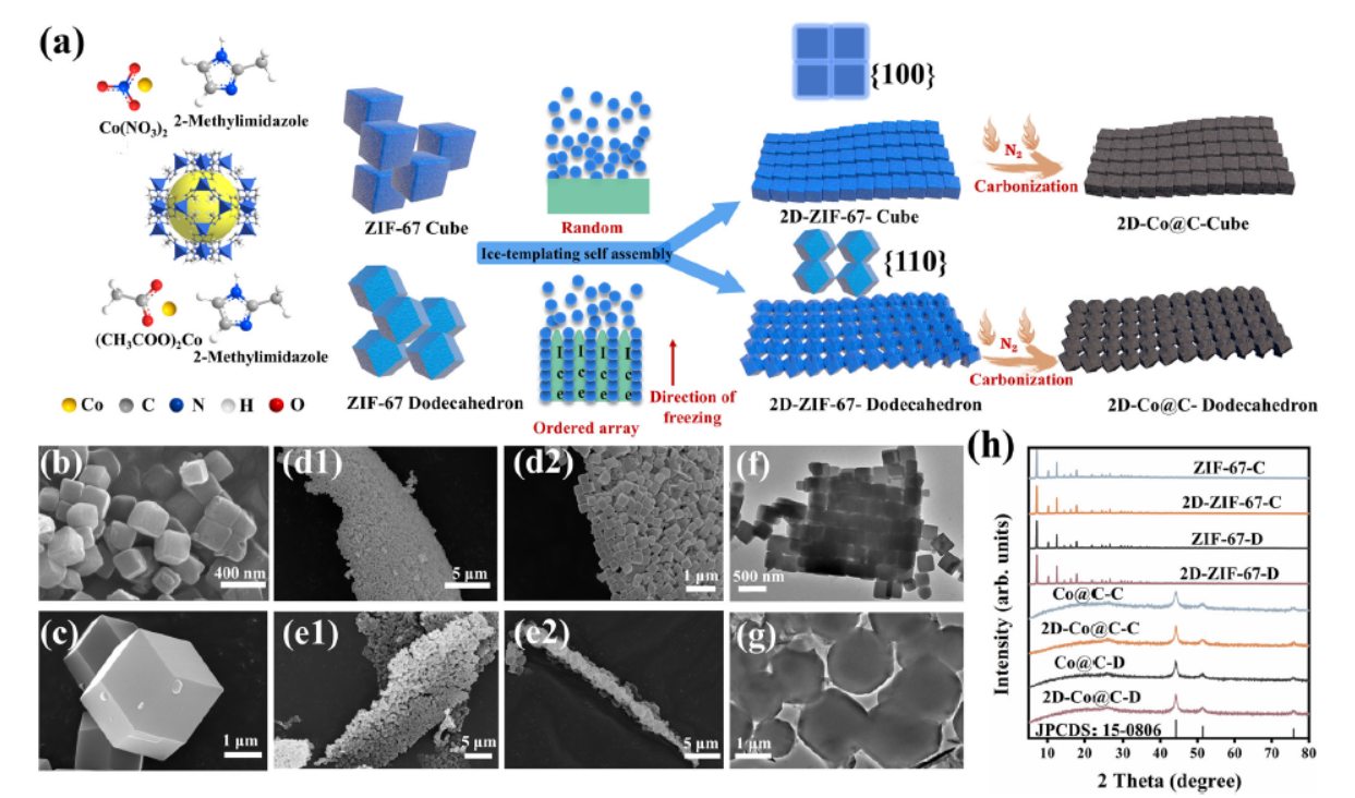 使用透射电子显微镜(TEM)和扫描电子显微镜(SEM)观察样品的微观结构和形貌。结果显示,ZIF-67-C和ZIF-67-D分别形成了立方体和十二面体结构,且在二维有序阵列中,纳米颗粒紧密排列,形成了规则的二维结构。
