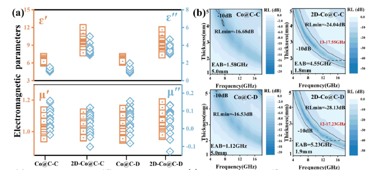 根据传输线理论计算样品在不同厚度下的反射损耗。结果显示,2D-Co@NC-C在1.82 mm厚度下实现了6.41 GHz的超宽带微波吸收,覆盖了Ku波段的大部分频率范围。2D-Co@NC-D在1.84 mm厚度下实现了5.67 GHz的吸收带宽,覆盖了10.8–16.47 GHz的频率范围。