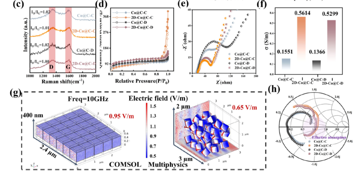 使用EIS测试样品的电荷转移阻抗。结果显示,二维有序阵列显著降低了电荷转移阻抗,表明其在电磁场中的介电响应能力增强。具体数值显示,2D-Co@C-C的电荷转移阻抗降低了约362%,2D-Co@C-D降低了约388%。