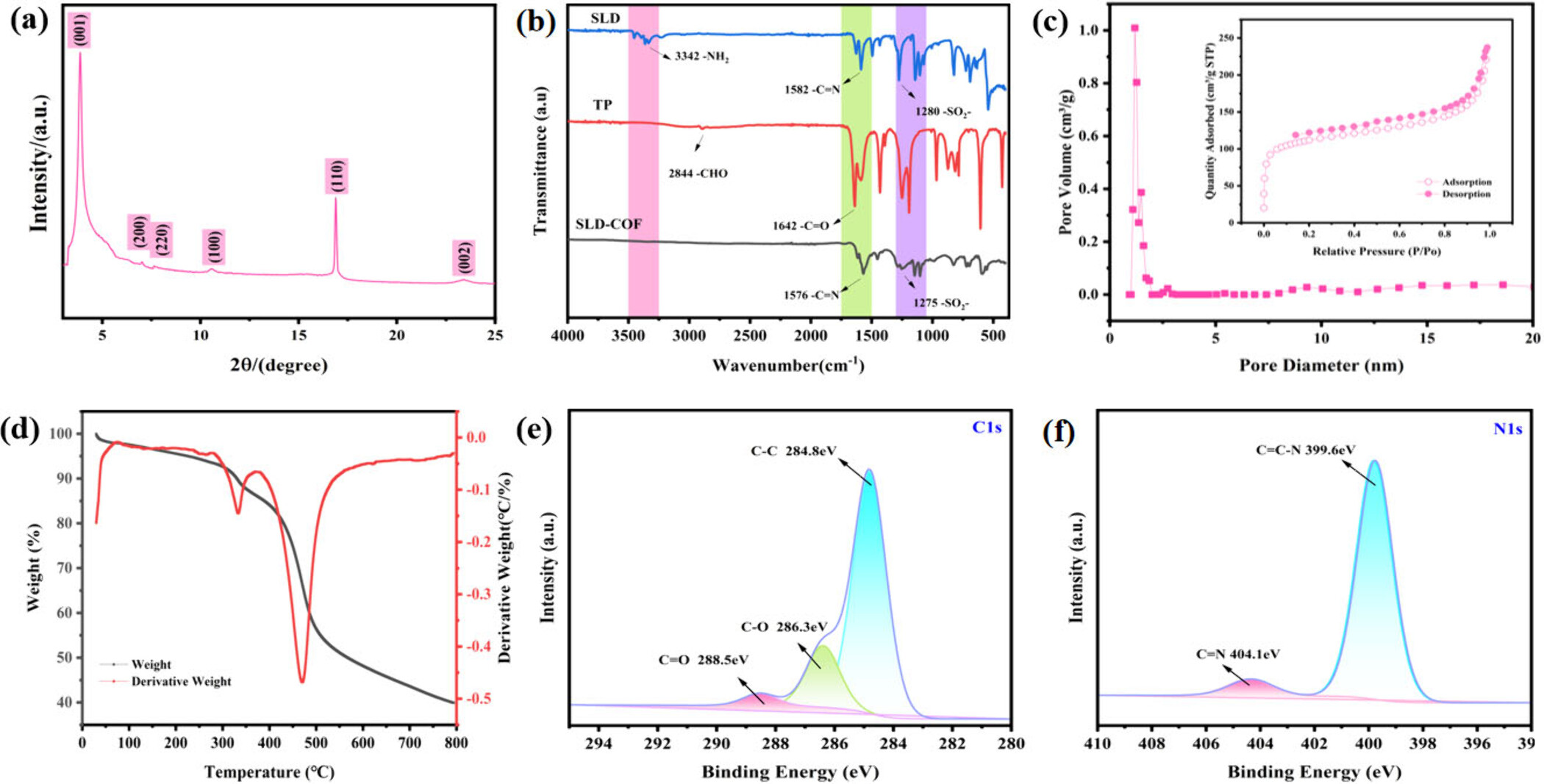 测试结果:SLD-COF中C、N、O、S元素的存在被确认,其中C 1s谱图显示了C-C(284.8 eV)、C=N(286.3 eV)和C=O(288.5 eV)的特征峰;N 1s谱图显示了亚胺-N(C=N,399.6 eV)和N-H(404.1 eV)的特征峰。