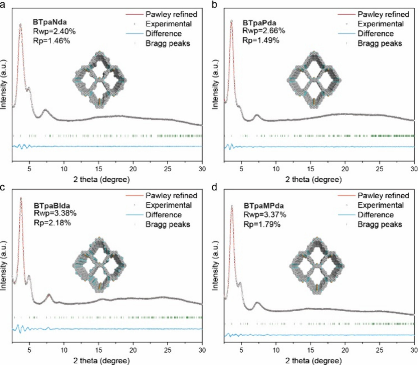 BTpaNda COF的PXRD图谱显示出三个明显的衍射峰,分别位于2θ = 3.7°、5.0°和7.3°,分别对应于(011)、(002)和(022)面。通过Pawley精修得到的单位晶胞参数为a = 3.74 Å,b = 32.98 Å,c = 35.35 Å,α = β = γ = 90°。所有实验PXRD图谱与Pawley精修轮廓吻合良好,且结构构建后的PXRD图谱模拟显示所有COFs均采用AA堆叠模式。