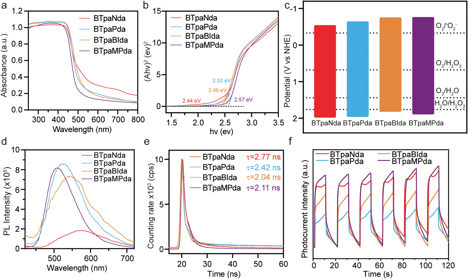 BTpaNda和BTpaMPda显示出最高的瞬态光电流强度,表明它们具有更好的电荷分离能力。