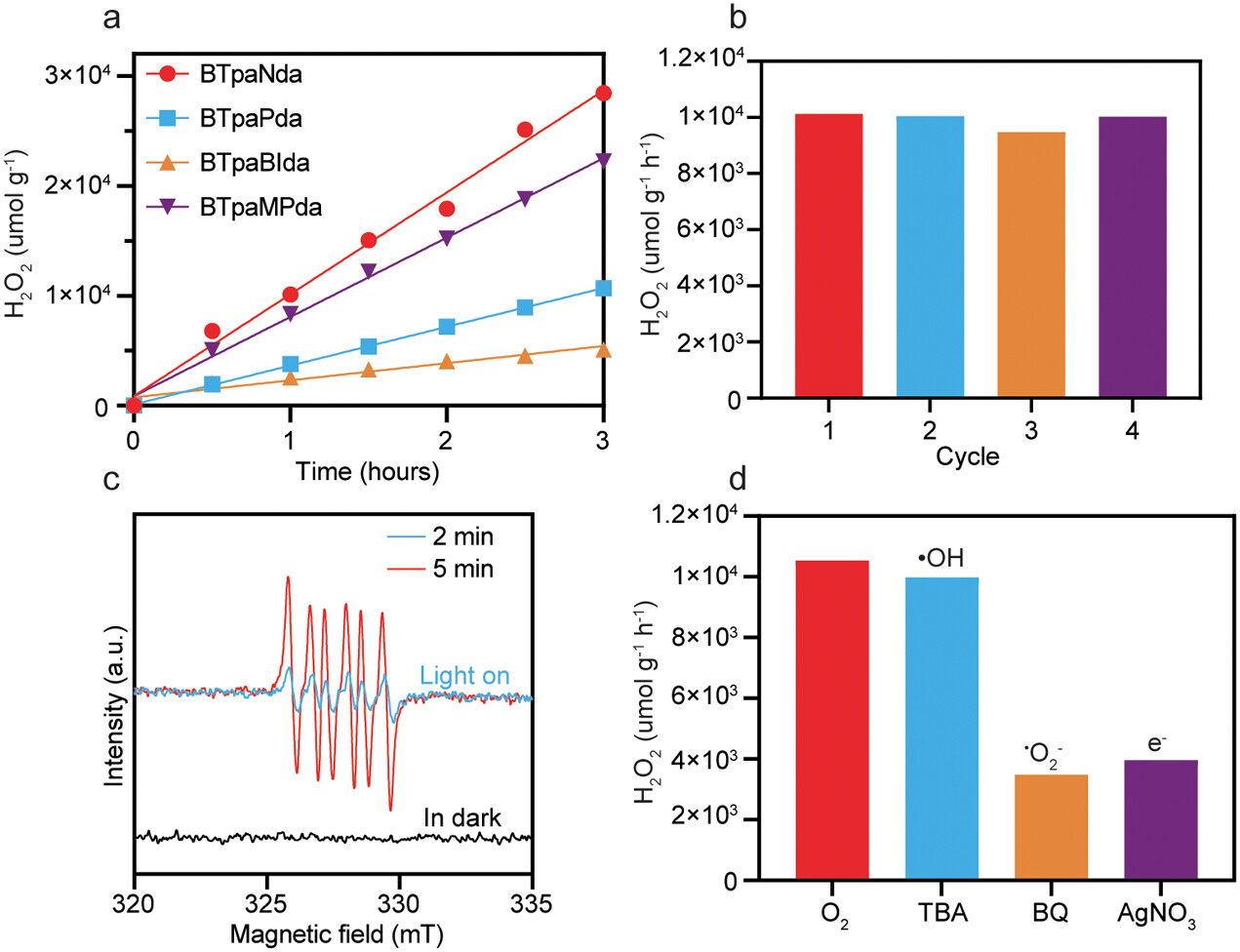 许多研究者通过调节光催化剂的结构、引入功能基团以及优化供体-受体配置来提高H2O2的光合成效率。
