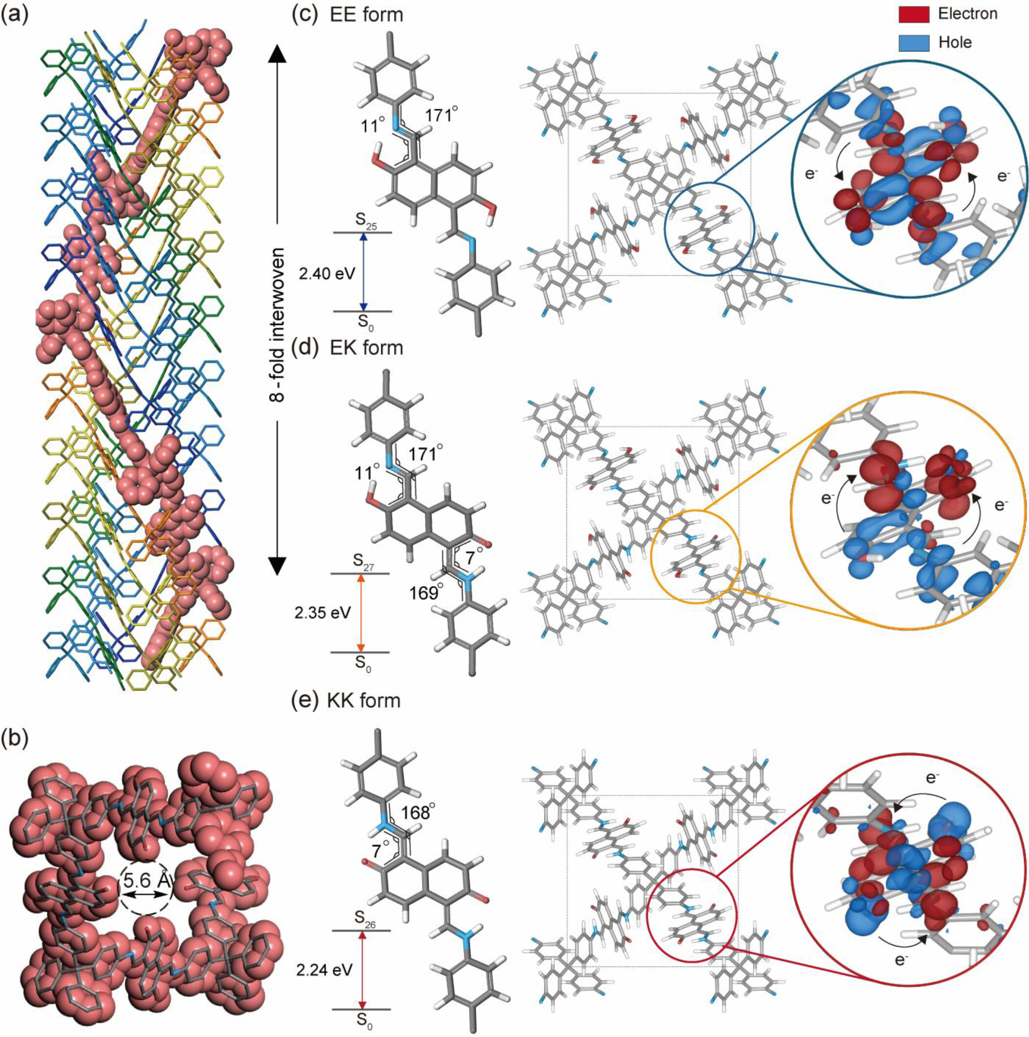理论计算揭示 EE、EK、KK 三种互变异构体的电子 - 空穴分布及激发态能量差异(图 2c–e)。