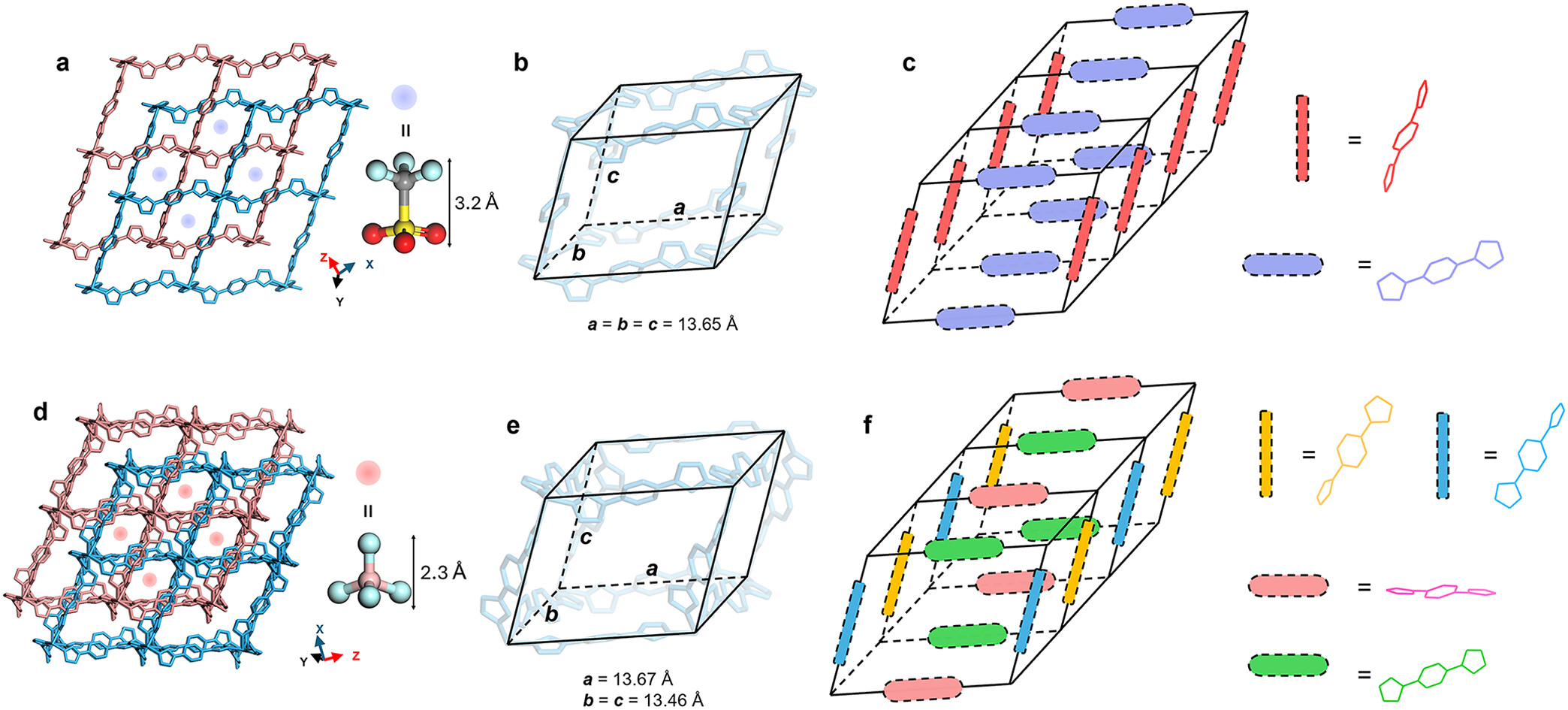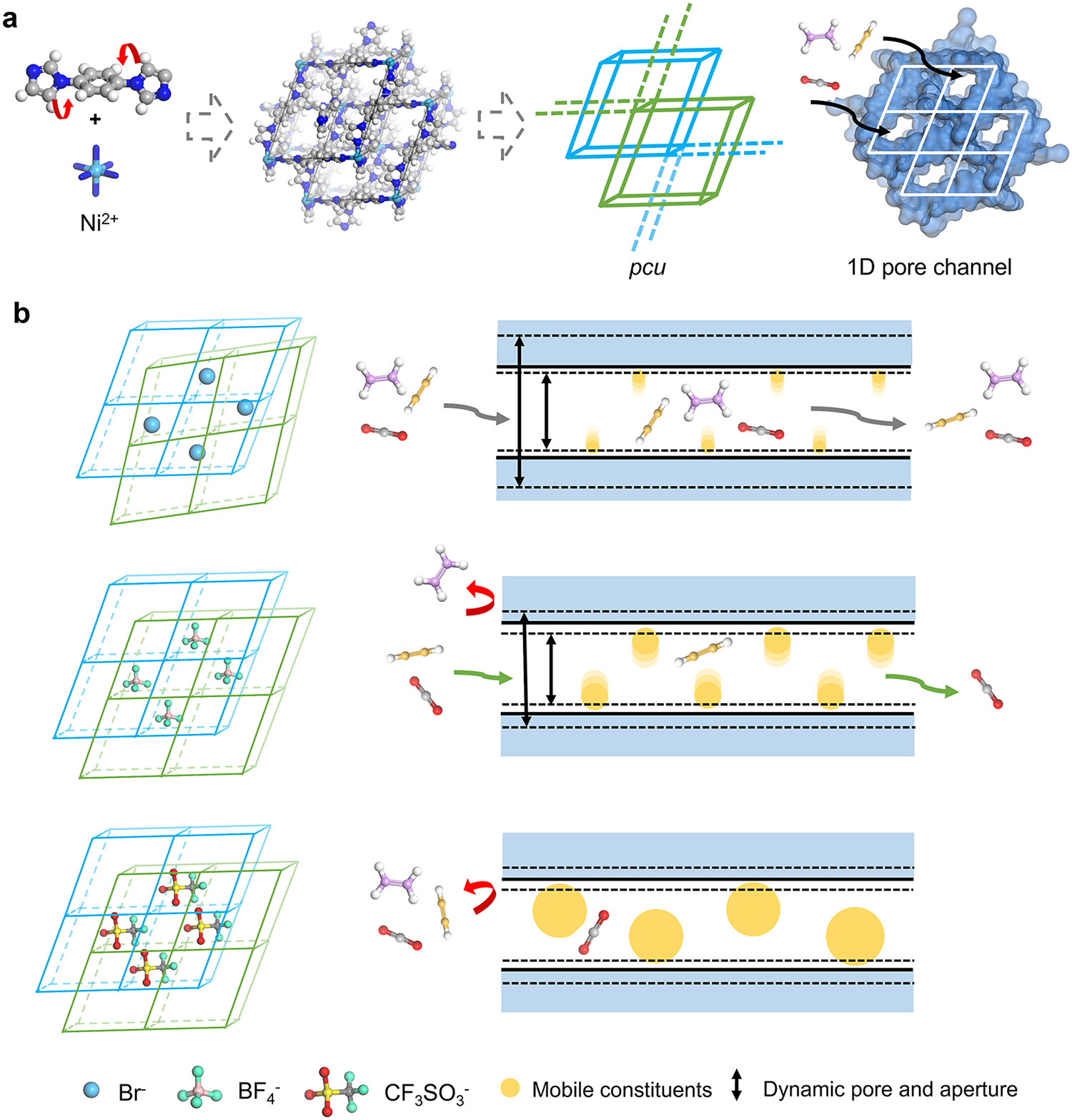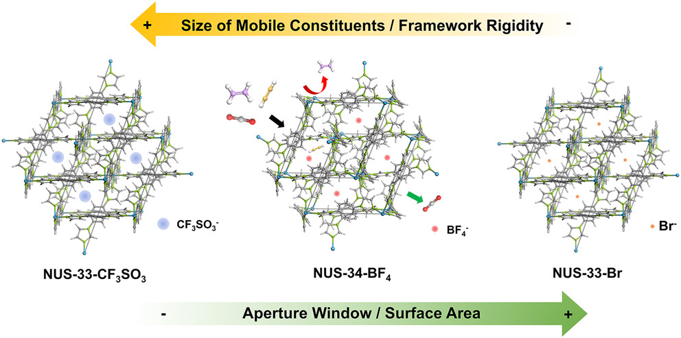 局部柔性:利用反离子(如 BF₄⁻、CF₃SO₃⁻)和配体旋转调节孔道亲和力。