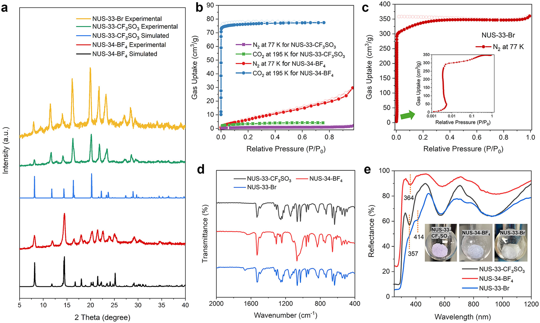 气体吸附测试:N₂(77 K)和 CO₂(195 K)吸附验证微孔特性,NUS-34-BF₄对 CO₂吸附量显著高于 NUS-33-CF₃SO₃;