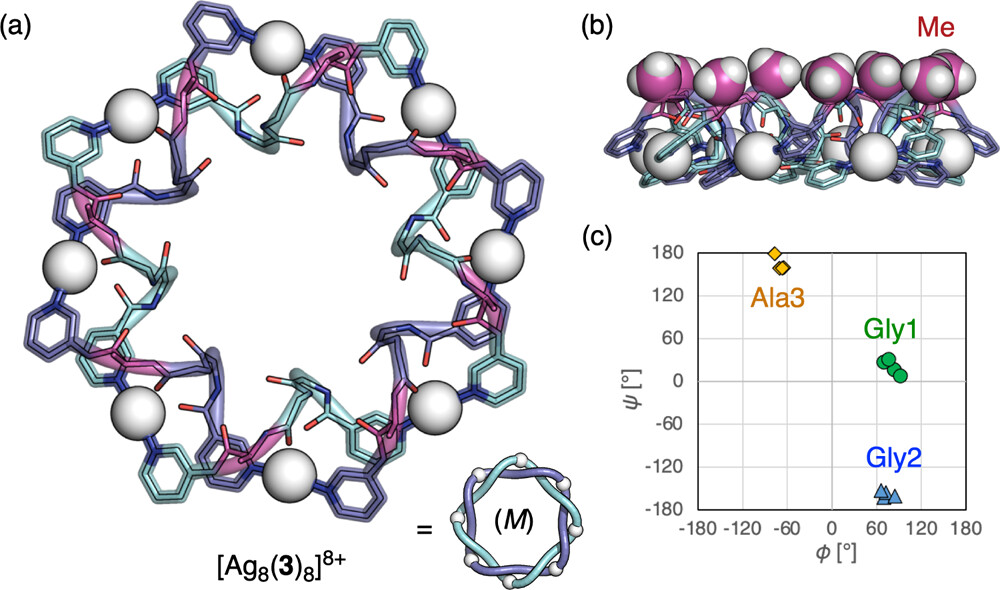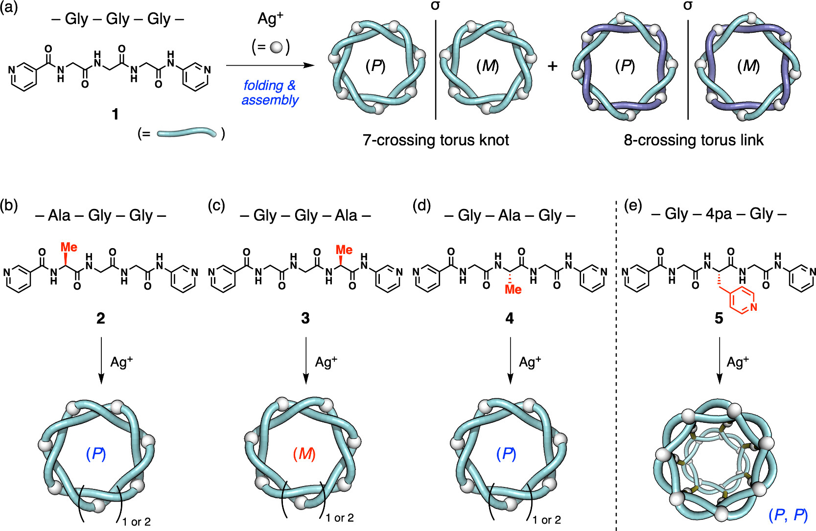 日本东京大学 Makoto Fujita 教授与东京工业大学 Tomohisa Sawada 教授团队(J. Am. Chem. Soc. 2025, 147, 9098−9102)通过非天然金属 - 肽链构建了具有环面结 / 链拓扑结构的螺旋框架。研究发现,L - 丙氨酸的二面角是控制螺旋手性的关键因素。通过设计含 Gly-Gly-Ala 和 Gly-Ala-Gly 序列的双齿三肽配体,结合 Ag (I) 离子自组装,成功实现了 (P)- 和 (M)- 螺旋结构的选择性合成。进一步引入含金属交联位点的三齿配体,构建了具有 (P)- 螺旋手性的 Ag₂₁L₁₄管状二聚体结构,为人工肽螺旋的理性设计提供了新策略。