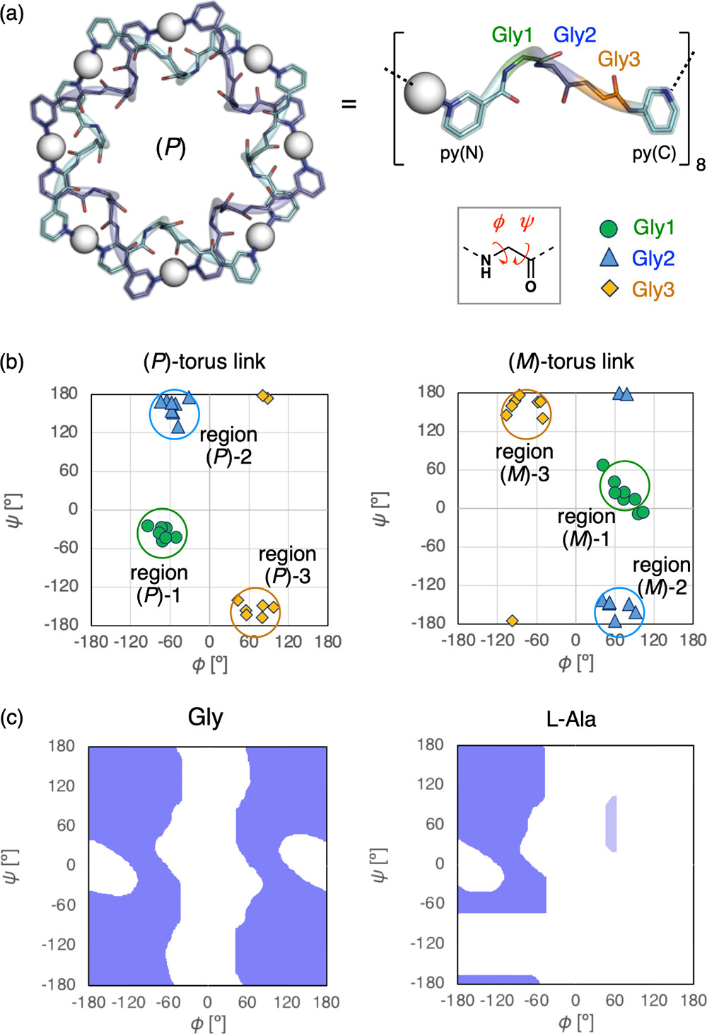 配体 3(Gly-Gly-Ala)形成 (M)- 螺旋 8 交叉环面链,L - 丙氨酸二面角位于 (M)-3 区域。
