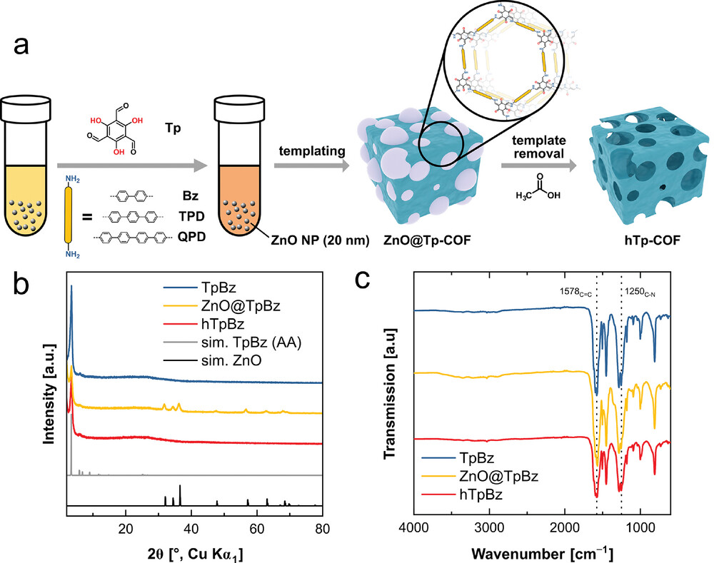 使用ZnO纳米颗粒作为模板,通过溶热法合成了层次孔隙COFs(hCOFs)。