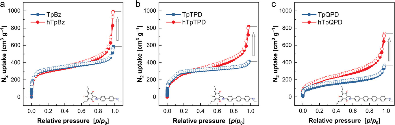 氮气吸附实验表明,hTpBz的总孔隙体积(1.54 cm³/g)显著高于非层次孔隙TpBz(0.91 cm³/g)。