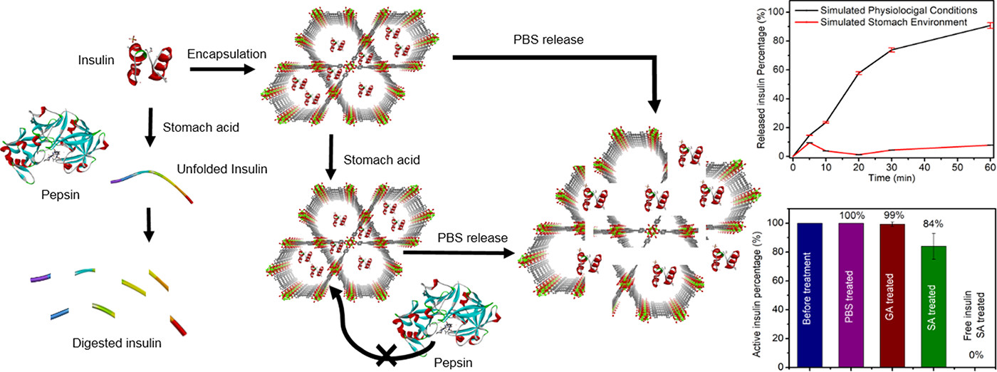全球数百万人群受糖尿病困扰且患者数量逐年增加,虽已有多种治疗1型和2型糖尿病的方法,但胰岛素抵抗患者仍需依赖胰岛素注射。本研究将胰岛素固定在结晶介孔金属有机框架NU-1000中,30分钟内实现约40 wt%的高负载量。该耐酸MOF胶囊能有效保护胰岛素免受胃酸和胃蛋白酶降解,且在模拟生理条件下可释放包封的胰岛素。