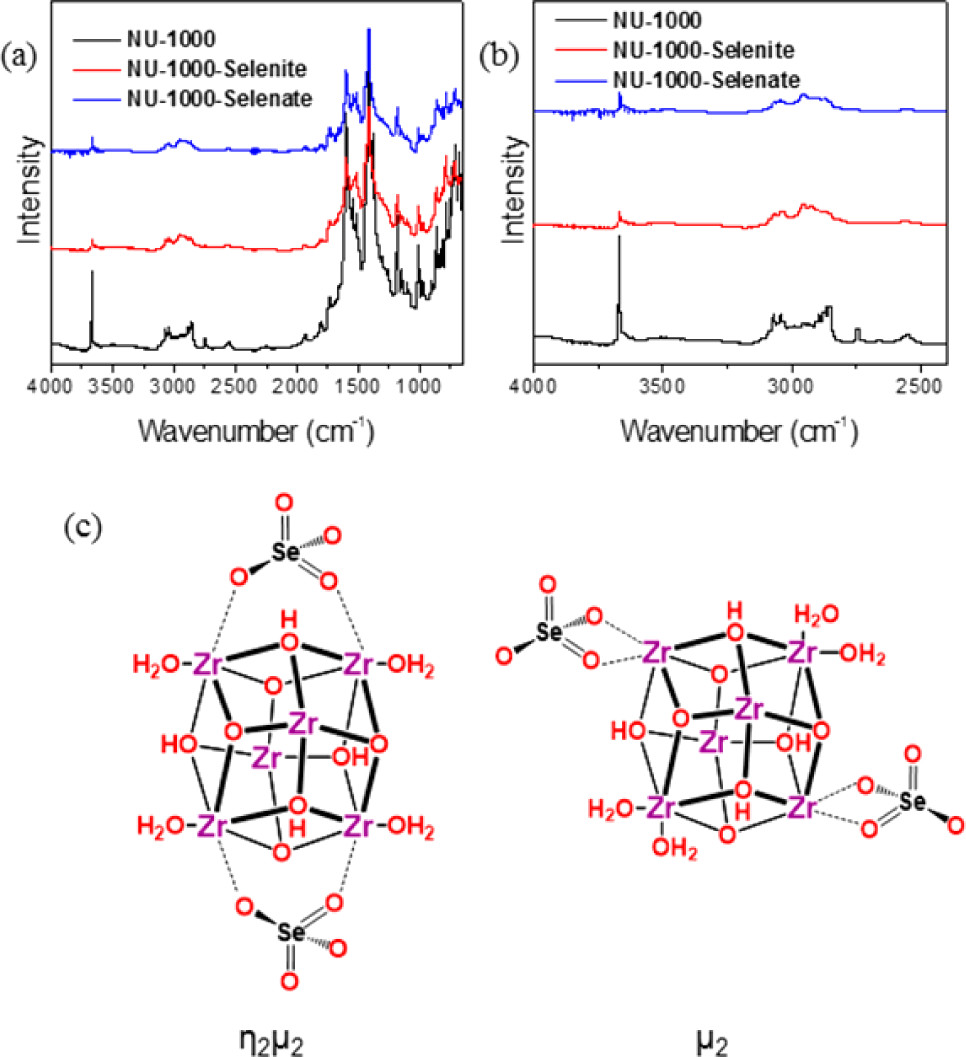 2.DRIFTS测试:分析NU-1000吸附前后红外光谱。吸附前,3670cm⁻¹有节点末端羟基峰,2745cm⁻¹有氢键相关峰;吸附后,前者大幅减弱,后者消失,表明每个硒氧阴离子取代2个末端羟基。