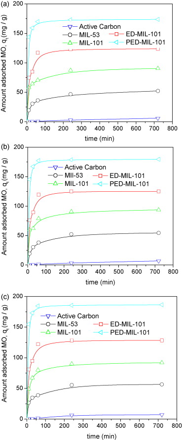 - 步骤:按文献方法制备MIL-53、MIL-101;依文献方法对MIL-101进行乙二胺接枝得ED-MIL-101;将ED-MIL-101用0.1M HCl溶液在室温下酸化6h得PED-MIL-101;购买颗粒度2-3mm的活性炭。