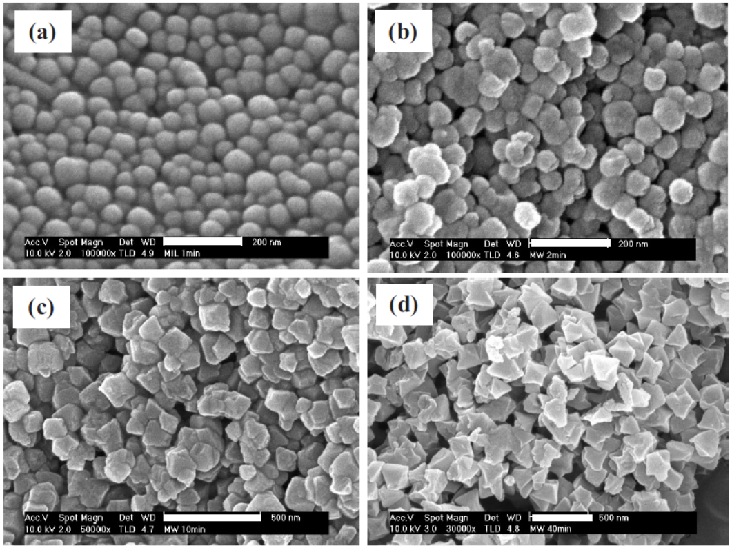 4.电镜分析:SEM和TEM显示微波合成的MIL-101为纳米级,MIL-101(1)尺寸40-80nm,随结晶时间增加颗粒增大且均一,MIL-101(40)呈立方对称。