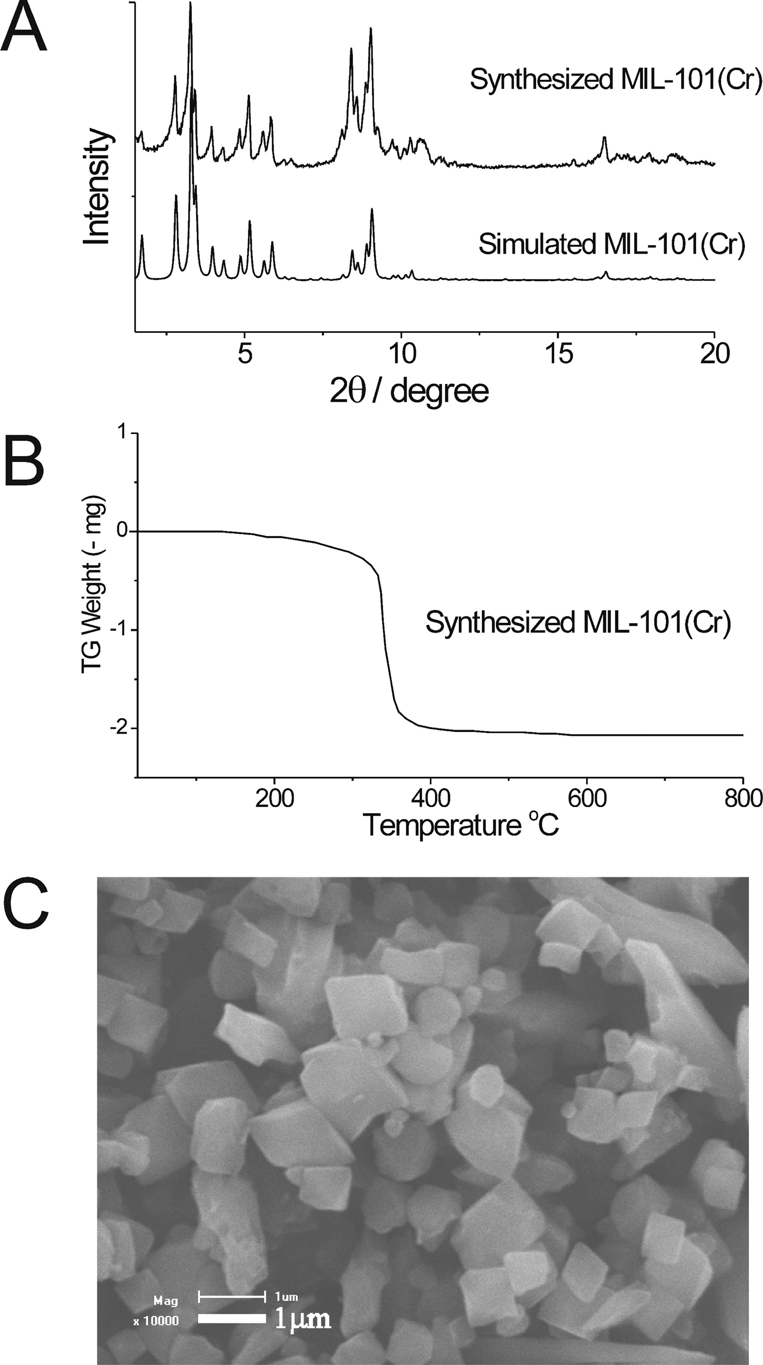 1.X射线衍射(XRD):用D/max-2500衍射仪(Cu Kα辐射,λ=1.5418Å)测试。结果:合成的MIL-101(Cr)XRD图谱与模拟图吻合,证明合成成功。
