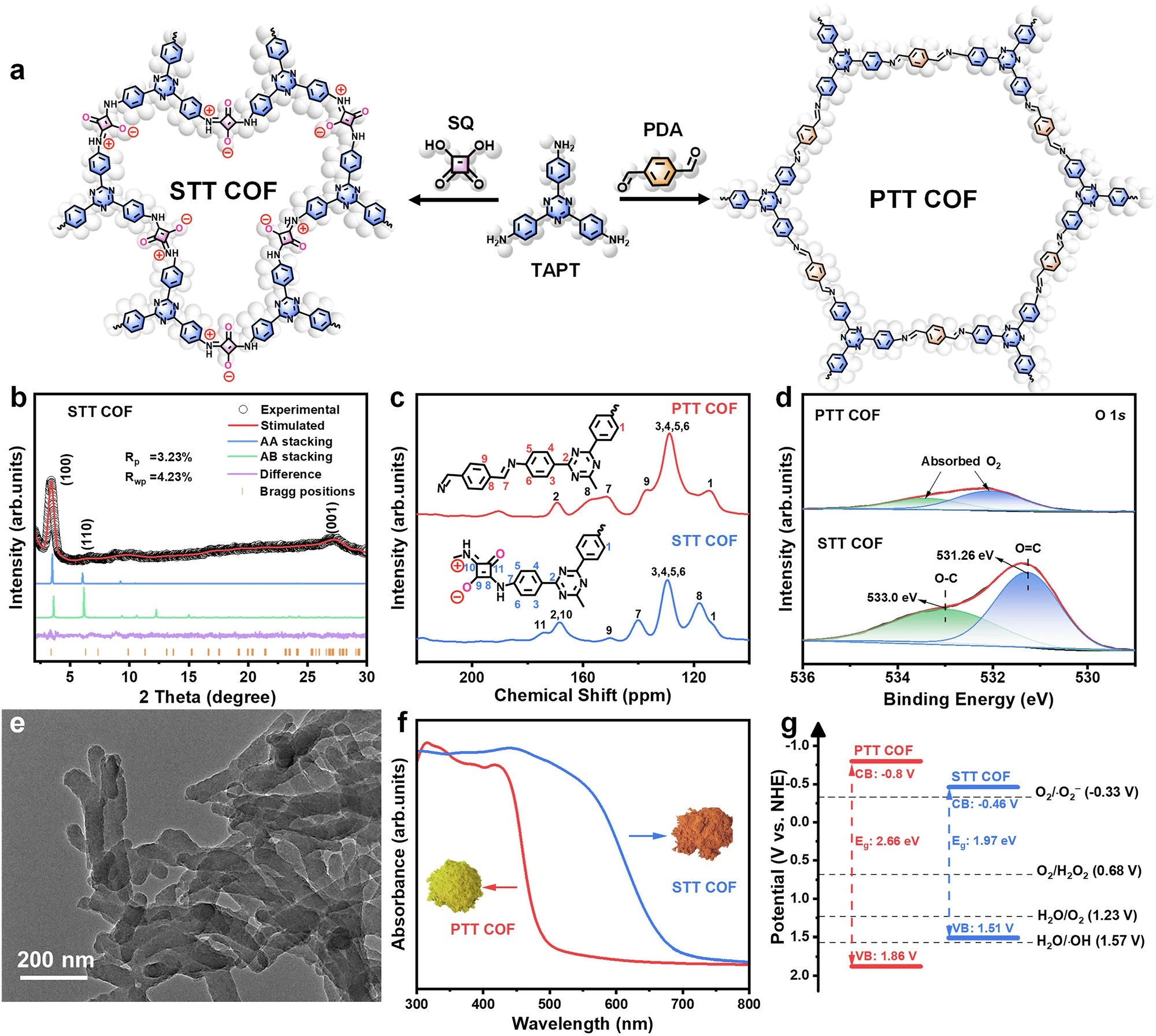 -电镜表征:SEM显示PTT COF为不规则纳米棒,STT COF为均匀纳米棒;TEM(STT COF)清晰呈现纳米棒结构,无明显团聚,利于光吸收与反应位点暴露。