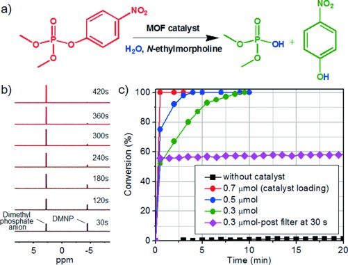 2.水解实验:在室温下,将不同用量(0.3、0.5、0.7、1.5μmol)MOF-808与DMNP在0.4M N-乙基吗啉溶液中混合,通过原位³¹P NMR监测反应,0.3μmol催化剂时30s水解50%,1.5μmol时30s内完全转化。