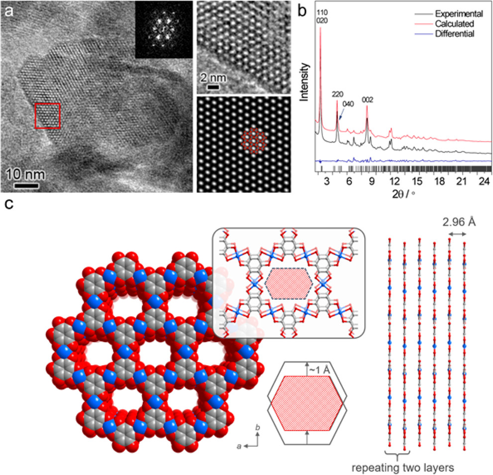 1.结构表征:XRD显示Cu-HHB为C心正交晶系(a=13.108Å,b=21.592Å,c=5.924Å),层间距2.96Å;TEM观察到片状形貌和椭圆孔结构。