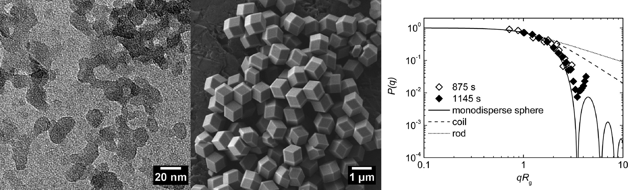 5.SEM/TEM:观察到纳米晶为菱形十二面体,微米晶生长中形状从立方体变为菱形十二面体,且纳米晶尺寸分布随时间先窄后宽。