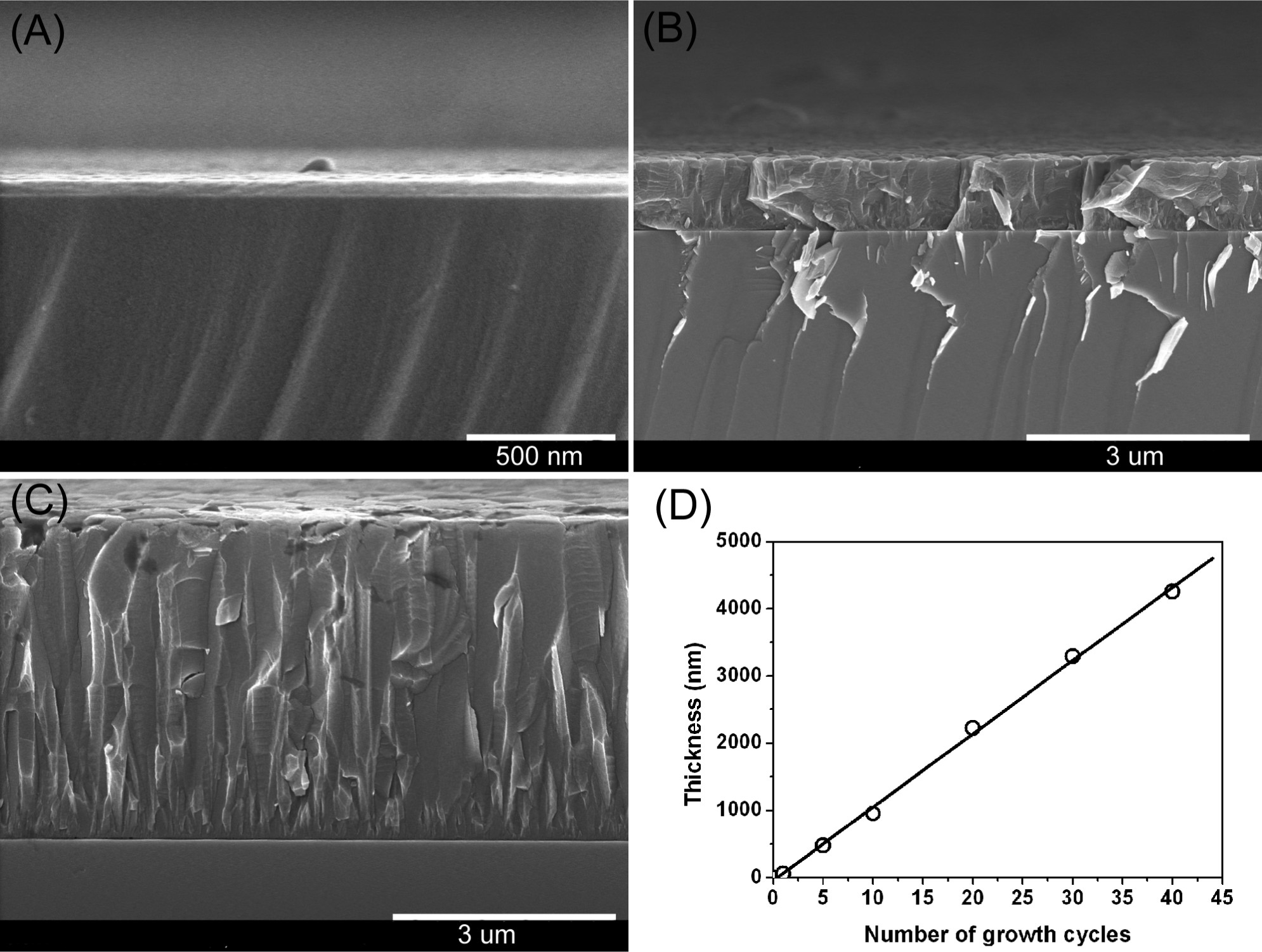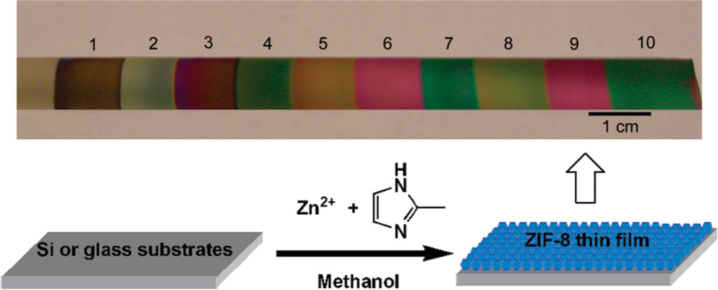 1.ZIF-8薄膜制备:玻璃/硅片经食人鱼溶液清洗、水洗、氮气干燥;制备25mM硝酸锌和50mM 2-甲基咪唑甲醇储备液;将基底浸入10mL两种储备液混合液30分钟,甲醇清洗、氮气干燥,重复可增厚(每循环约100nm,首循环约50nm)。