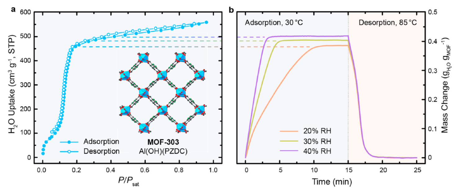 2.动态吸水性能测试:用热重分析仪(TGA),以250mL·min⁻¹氮气流,调节干湿氮气流比控制湿度,测试材料在30℃、20%-40%相对湿度下的吸附,及65-120℃、0%相对湿度下的解吸;MOF-303在20%相对湿度下10分钟饱和,85℃下数分钟完全再生。