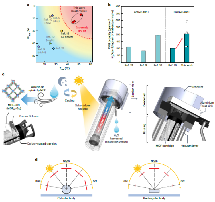 3.实验室与现场测试:实验室中,MOF柱140℃活化16h以上,20℃、35%RH吸附8h,再暴露于4000K、950W/m²光7h;现场测试在伯克利(6月)和死亡谷(8月)进行,夜间MOF柱露天吸水,白天组装装置测试。结果:伯克利日集水285g H₂O/kg MOF-303,死亡谷极端条件下仍能集水,最高210g H₂O/kg MOF-303。