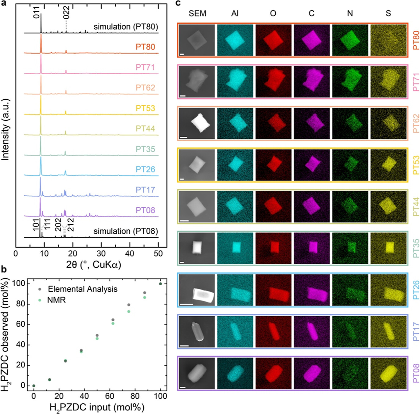 2.组成分析:NMR和EA显示PT-MOFs中H₂PZDC输出比例与输入比例成比例;SEM-EDS证实两种 linker在晶体内均匀分布。