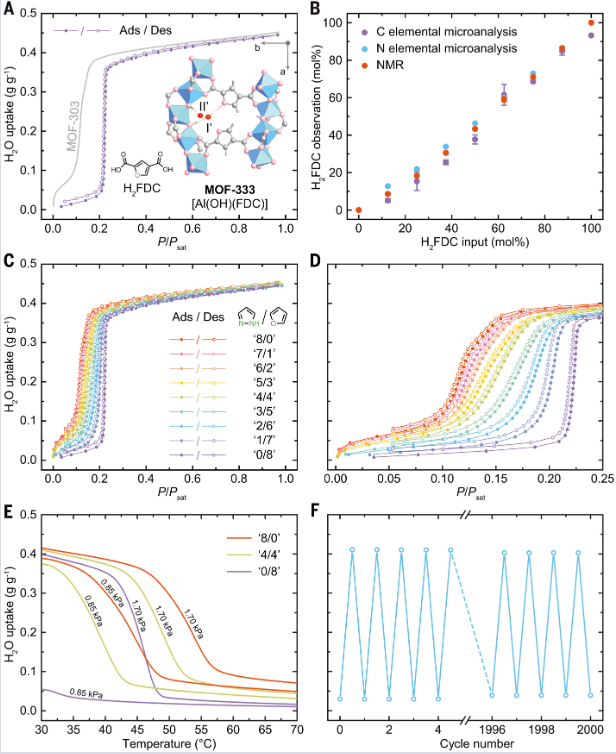 3. 水吸附测试:MOF-333在22%RH有陡峭吸附台阶,无MOF-303的初始台阶S;随FDC²⁻比例增加,多元MOF吸附等温线台阶向高蒸气压移动,吸附焓从-53kJ/mol变为-50kJ/mol,解吸温度降低达10℃。