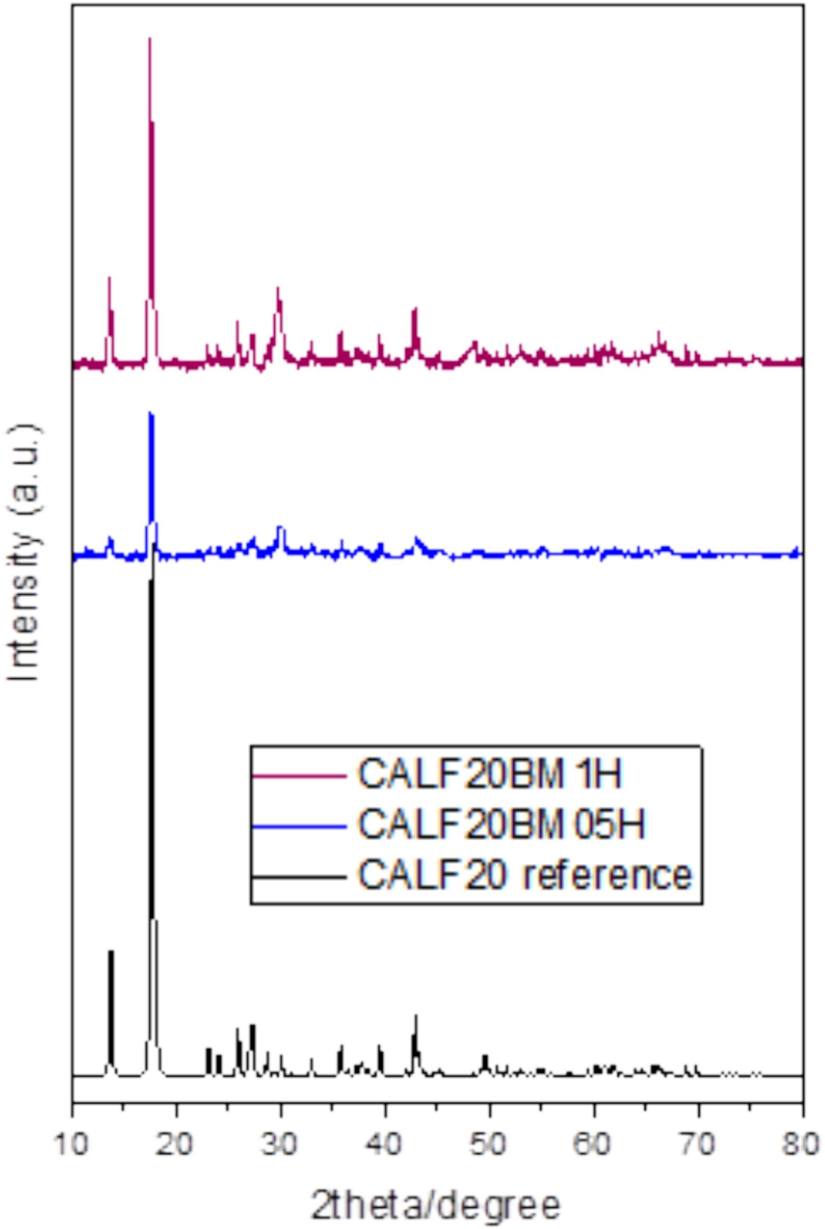 1. XRD分析:两种样品均形成CALF-20相,晶粒尺寸分别为65±2 nm和171±4 nm,结晶度随研磨时间增加而提升。