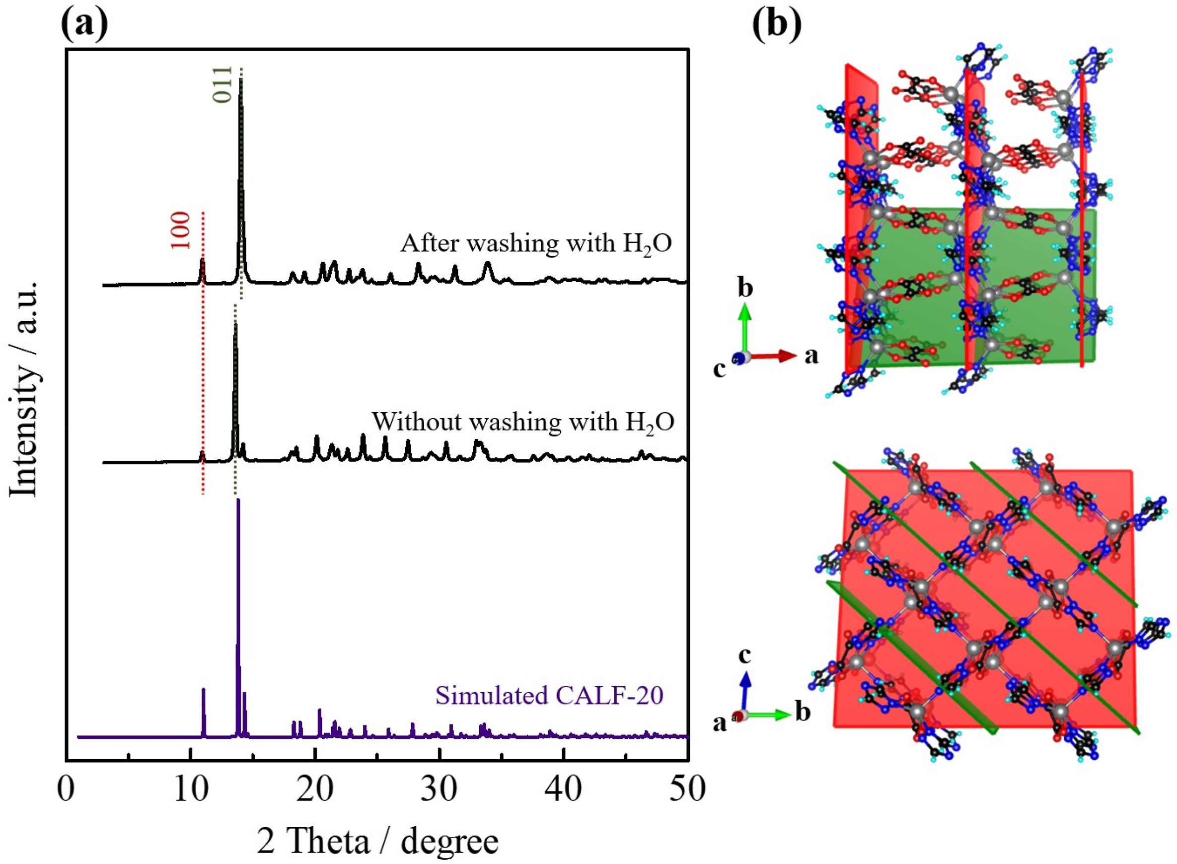 1. PXRD分析:水/甲醇体积比16:4时产物为纯CALF-20相,6分钟即可结晶,水洗后(011)晶面2θ为14.0°。