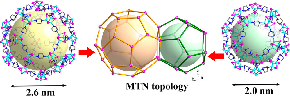 以四面体Cu₄I₄簇为基础,成功构建了含巨型6⁴5¹²和5¹²笼的新型MTN型簇有机框架(COZ-1)。其中6⁴5¹²笼内径2.6 nm、孔容9.2 nm³,该框架整合了簇与骨架的多孔性和光致发光性能。