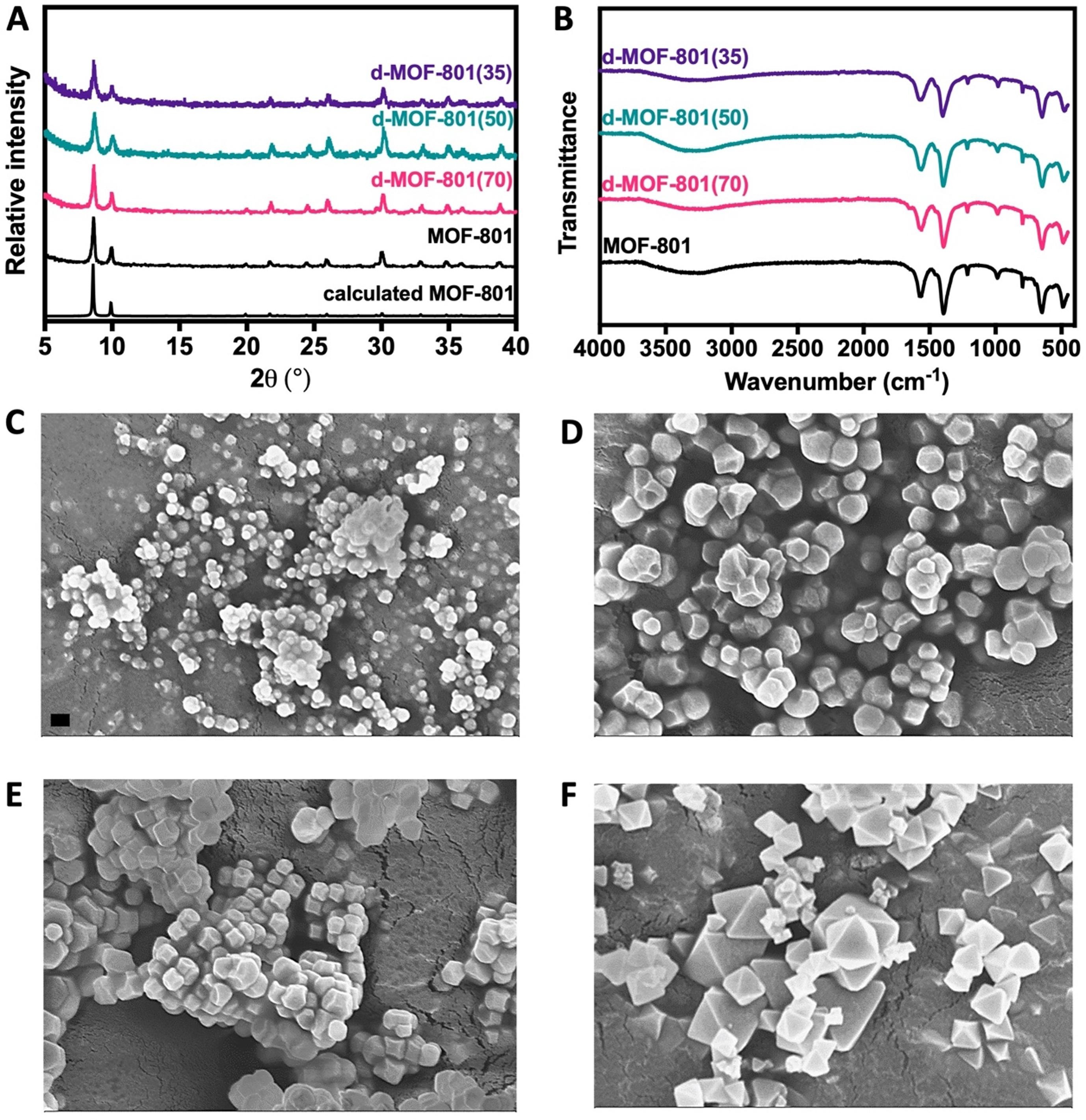 1. 结构表征:PXRD证实样品为MOF-801晶型,d-MOF-801结晶度略低;SEM显示d-MOF-801为球形颗粒(<200 nm),MOF-801为八面体(~500 nm)。