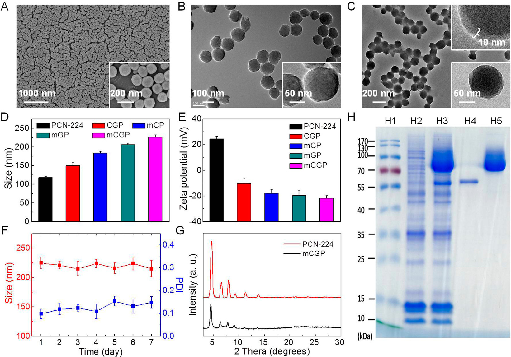 1. 结构表征:mCGP为核壳结构,粒径227.5 nm,ζ电位-20.9 mV,7天内稳定性良好,PXRD证实保留PCN-224晶体结构。